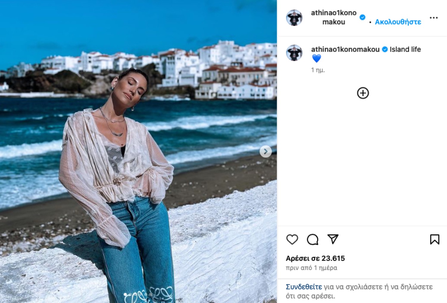 Η Αθηνά Οικονομάκου ανέβασε φωτογραφίες από τις διακοπές της με φόντο τα κύματα. Μάλιστα για την εμφάνισή της επέλεξε μια frilly ημιδιάφανη μπλούζα με ψηλόμεσο μπλε τζιν παντελόνι Loewe.