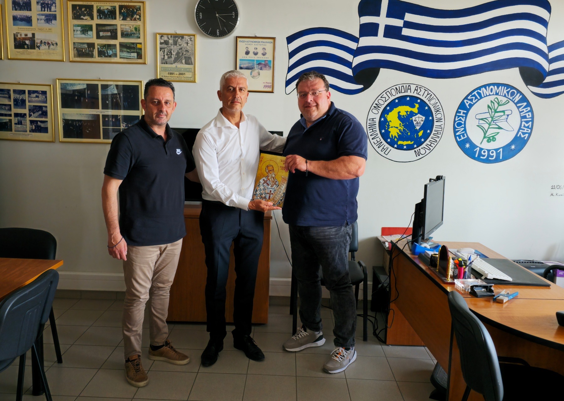 Συναντήθηκε με το Πρόεδρο και το Γενικό Γραμματέα της Ένωσης Αστυνομικών Λάρισας καθώς και με εν υπηρεσία αστυνομικούς.