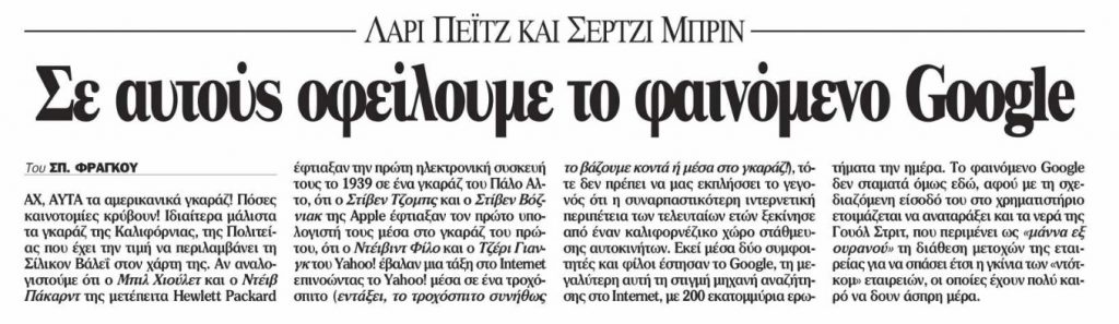 «Η συναρπαστικότερη ιντερνετική περιπέτεια των τελευταίων ετών ξεκίνησε από έναν καλιφορνέζικο χώρο στάθμευσης αυτοκινήτων. Εκεί μέσα δύο συμφοιτητές και φίλοι έστησαν το Google, τη μεγαλύτερη αυτή τη στιγμή μηχανή αναζήτησης στο Internet, με 200 εκατομμύρια ερωτήματα την ημέρα.