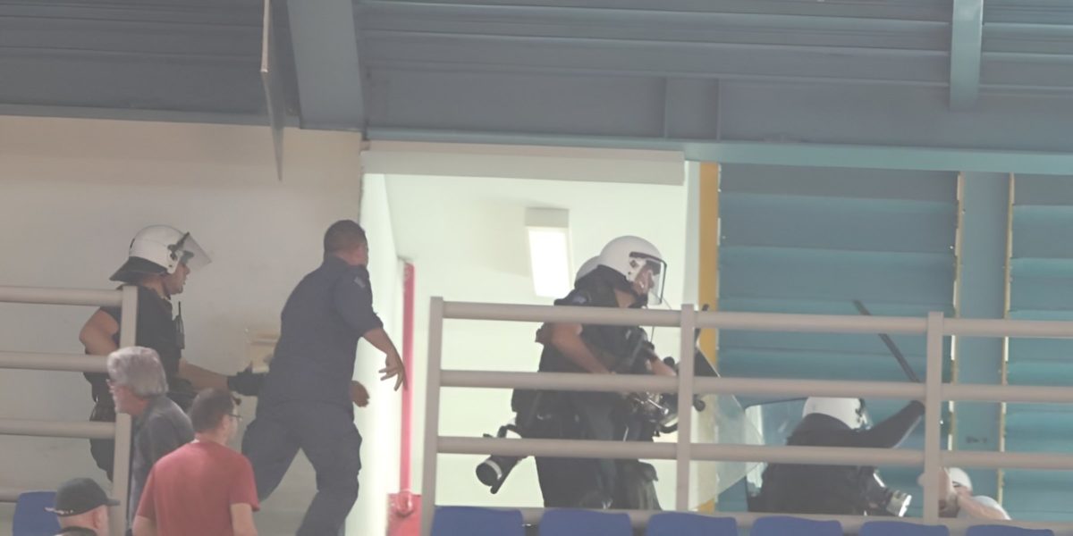 Ειδικότερα, κατά την διάρκεια της ανάπαυλας του ημιχρόνου ποδοσφαιρικού αγώνα, φίλαθλοι εξήλθαν από κερκίδα του γηπέδου στον περιφραγμένο περιβάλλοντα χώρο αυτού, και αναίτια άρχισαν να εκσφενδονίζουν αντικείμενα (πέτρες, μπουκάλια κ.ά.) προς τις αστυνομικές δυνάμεις που βρίσκονταν στο σημείο.