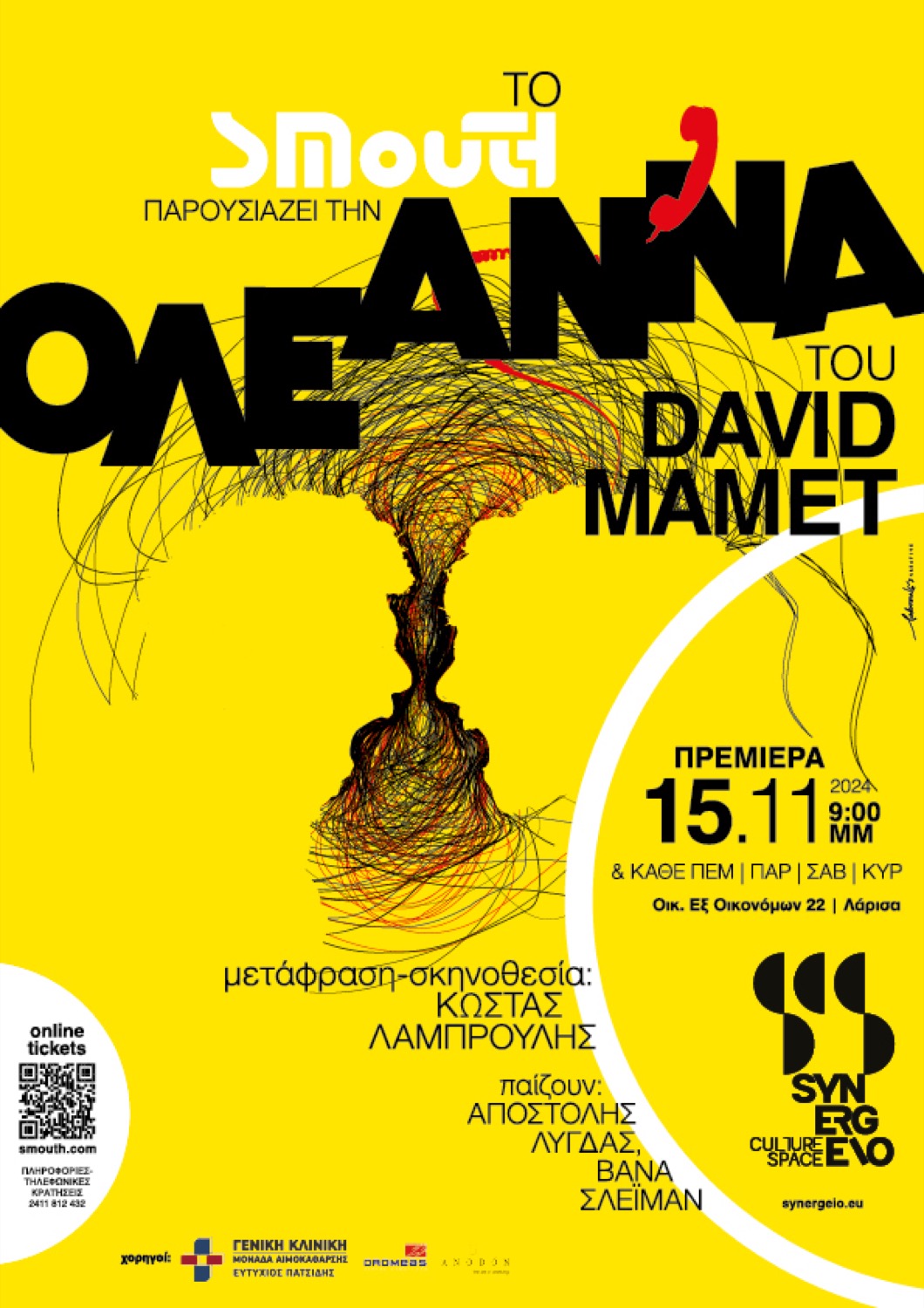Το Συνεργείο Μουσικού Θεάτρου παρουσιάζει το πολυσυζητημένο έργο του Ντέιβιντ Μάμετ ‘’Ολεάννα’’ σε σκηνοθεσία Κώστα Λαμπρούλη, στο νέο του πολυχώρο ‘’Synergeio, χώρος πολιτισμού’’. Η πρεμιέρα της παράστασης προγραμματίζεται για την Παρασκευή 15 Νοεμβρίου 2024 και θα συνεχίζεται κάθε Πέμπτη έως και Κυριακή.