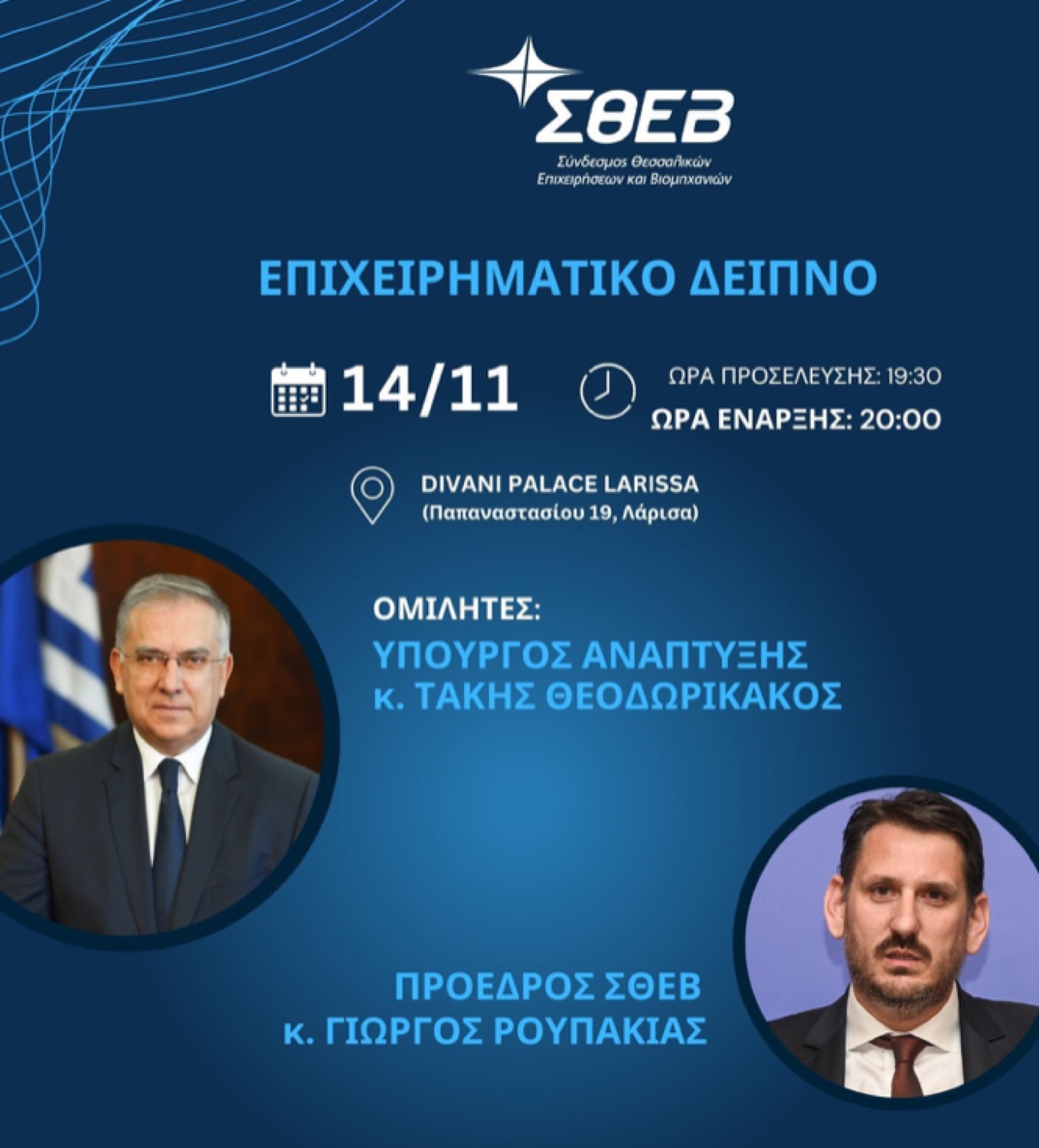 Ο υπουργός Ανάπτυξης κ. Τάκης Θεοδωρικάκος θα είναι ο επίσημος προσκεκλημένος στο καθιερωμένο επιχειρηματικό δείπνο που διοργανώνει ο ΣΘΕΒ για τις επιχειρήσεις – μέλη του, την Πέμπτη 14 Νοεμβρίου και ώρα 19.30 στη Λάρισα, στο ξενοδοχείο Divani Palace.