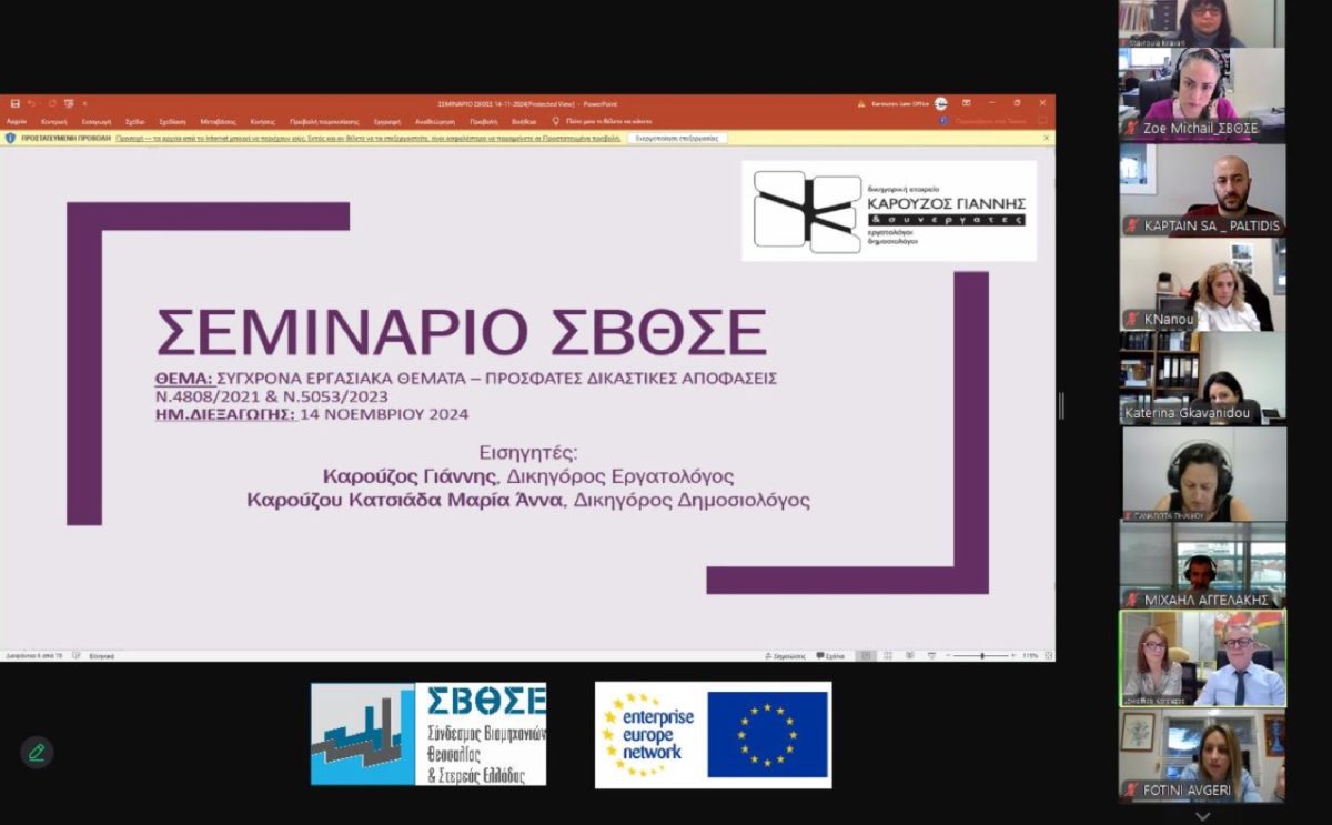 Με ιδιαίτερη επιτυχία πραγματοποιήθηκε την Πέμπτη 14 Νοεμβρίου 2024, το ενημερωτικό διαδικτυακό σεμινάριο που πραγματοποίησε ο Σύνδεσμος Βιομηχανιών Θεσσαλίας & Στερεάς Ελλάδος-ΣΒΘΣΕ σε συνεργασία με το δικηγορικό γραφείο του Δικηγόρου- Εργατολόγου κ Γιάννη Καρούζου, με θέμα: «Σύγχρονα εργασιακά θέματα – Πρόσφατες Δικαστικές Αποφάσεις του Ν. 4808/2021 & Ν.5053/2023», μέσω της πλατφόρμας zoom.