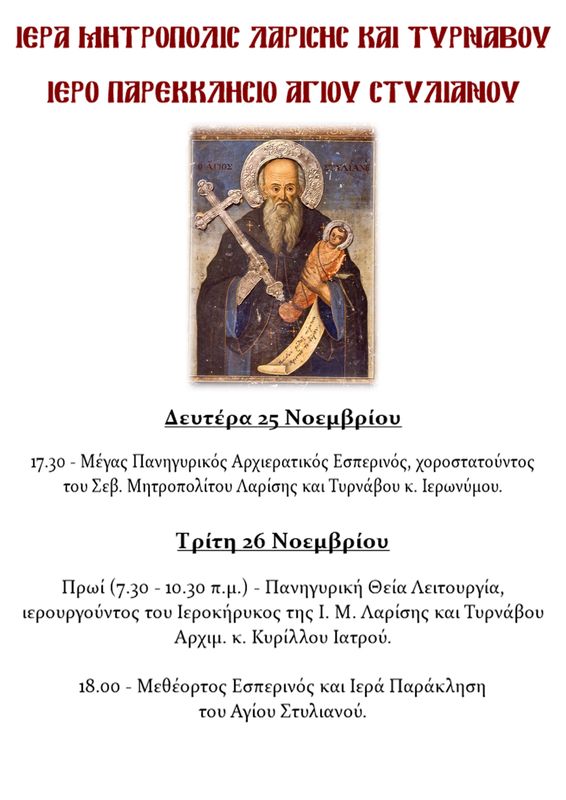 - Κυριακή 26 Νοεμβρίου και ώρα 18:00, θα τελεστεί ο μεθέορτος Εσπερινός και η Ιερά Παράκληση του Αγίου Στυλιανού.