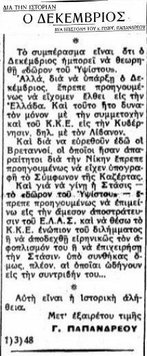 «…Κατέχομαι από την συνείδησιν ότι χάριν εις την πολιτικήν την οποίαν ηκολούθησα κατά τους κρισιμώτατους εκείνους μήνας, κατά τους οποίους η Μοίρα με είχεν επιφορτίσει με την ευθύνην της Ελλάδος, κατέστη δυνατή η συντριβή της Κομμουνιστικής Τυραννίας η οποία τότε ήτο παντοδύναμος και εδυνάστευε την Ελλάδα. …Μετά την συντελεσθείσαν πλήρη Απελευθέρωσιν της Ελλάδος λήγει και η Αντίστασις. Είναι επομένως φυσικόν, ότι επακολουθεί η αποστράτευσις των Ανταρτικών Ομάδων ΕΛΑΣ και ΕΔΕΣ, η οποία ωρίσθη δια την 10ην Δεκεμβρίου. «Και δια τούτο επέμεινα ανενδότως εις την άμεσον αποστράτευσιν. Και η 10ηΔεκεμβρίου έμενεν αμετακίνητος… Και όταν έφθασεν η ώρα της πραγματοποιήσεως και το ΚΚΕ διεπίστωσεν ότι αι αποφάσεις μου δεν ήσαν απλαί λέξεις, αλλά πράξεις, και ότι, αφοπλιζόμενον, θα μετεβάλλετο πλέον από παντοδύναμος δυνάστης εις μικρόν πολιτικόν κόμμα μειοψηφίας, απετόλμησεν την Στάσιν. (…) «Το συμπέρασμα είναι ότι ο Δεκέμβριος ημπορεί να θεωρηθή «δώρον του Υψίστου». Αλλά, δια να υπάρξη ο Δεκέμβριος, έπρεπε προηγουμένως να είχωμεν έλθει εις την Ελλάδα. Και τούτο ήτο δυνατόν μόνο με την σνμμετοχήν και τον ΚΚΕ εις την κυβέρνησίν, δηλαδή με τον Λίβανον. Και δια να ευρεθούν εδώ οι Βρετανοί, οι οποίοι ήσαν απαραίτητοι δια την Νίκην, έπρεπε προηγουμένως να είχεν υπογραφή το Σύμφωνον της Κα-ζέρτας. Και δια να γίνη η Στάσις – «το δώρον του Υψίστου» – έπρεπε προηγουμένως να επιμείνω εις την άμεσον αποστράτευσιν του ΕΛΑΣ και να θέσω το ΚΚΕ ενώπιον του διλήμματος ή να αποδεχθή ειρηνικώς τον αφοπλισμόν του ή να επιχείρηση την Στάσιν, υπό συνθήκας όμως πλέον, αι οποίοι ωδήγουν εις την συντριβήν του. Αυτή είναι η ιστορική αλήθεια».
