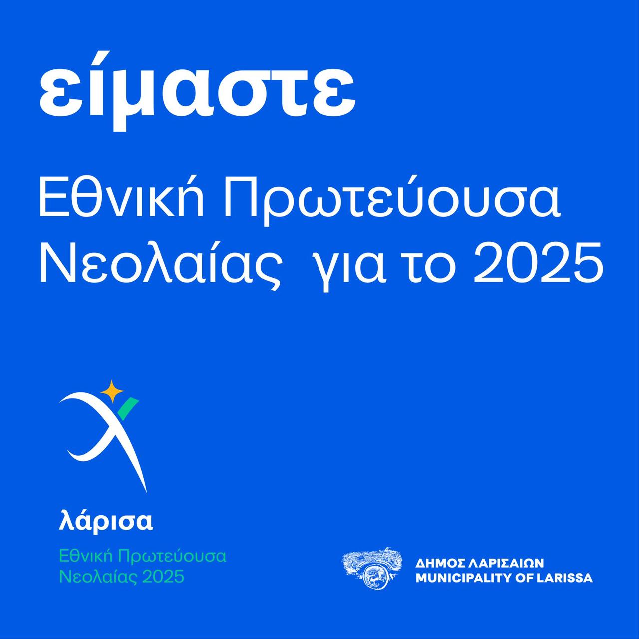 Εθνική Πρωτεύουσα Νεολαίας 2025 ανακηρύχθηκε η Λάρισα, με την «καρδιά» της νέας γενιάς να χτυπά στην «καρδιά» της χώρας, για τον επόμενο χρόνο. Υπενθυμίζεται ότι το Δημοτικό Συμβούλιο Νεολαίας και ο Δήμος Λαρισαίων είχαν καταθέσει υποψηφιότητα στο σχετικό πρόγραμμα του Υπουργείου Κοινωνικής Συνοχής και Οικογένειας, ανεβάζοντας ψηλά τον πήχυ για την ανάδειξη της νεολαίας ως βασικού πυλώνα ανάπτυξης και προόδου.