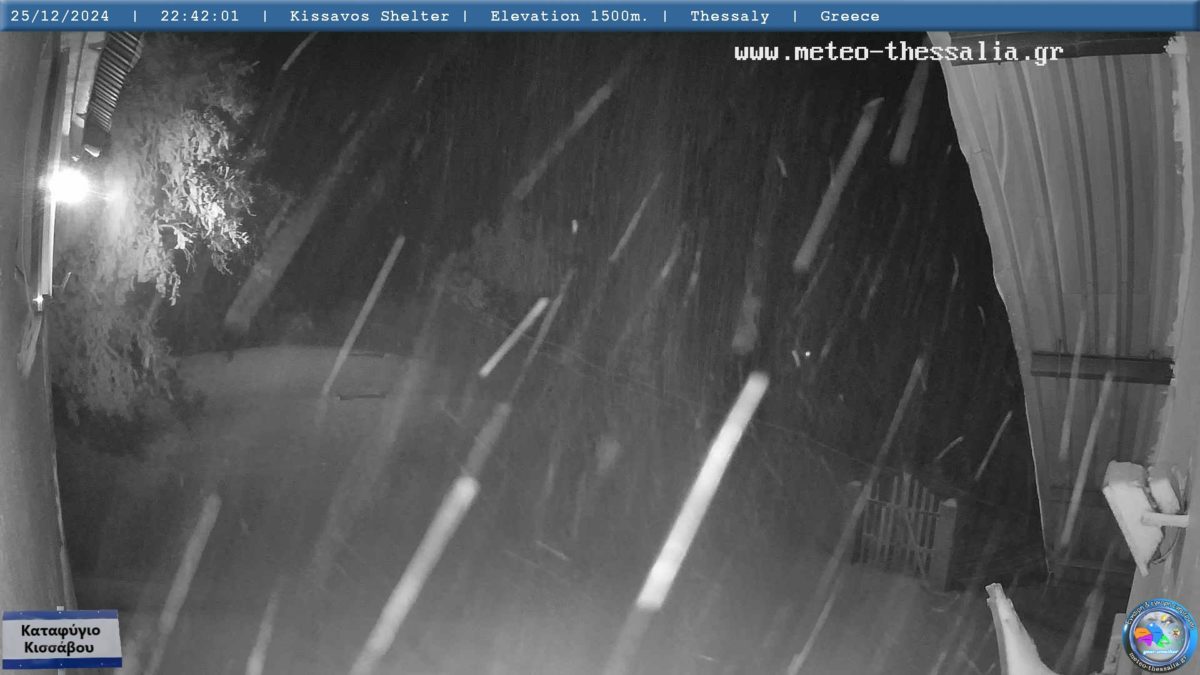 Ισχυρή χιονόπτωση σημειώνεται στο καταφύγιο Κισσάβου στα 1.500 μ. όπως μεταφέρει σε live μετάδοση η μετεωρολογική κάμερα του meteo-thessalia.gr.