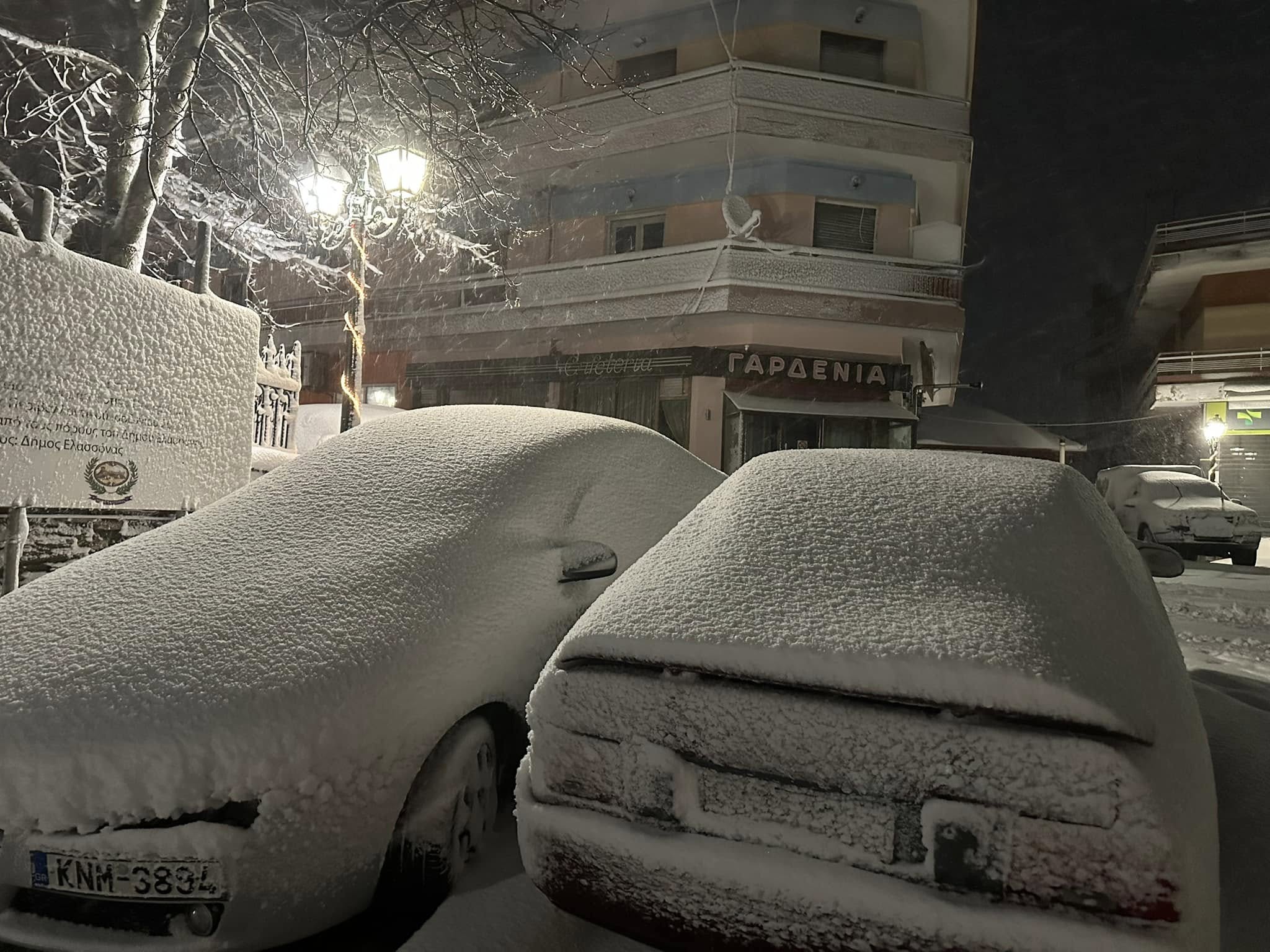 Το ίδιο λευκό σκηνικό και στη Σπηλιά Κισσάβου, με το χιόνι να το έχει στρώσει 5 εκατοστά, ανοιχτούς και βατούς δρόμους και μηδέν βαθμούς Κελσίου.