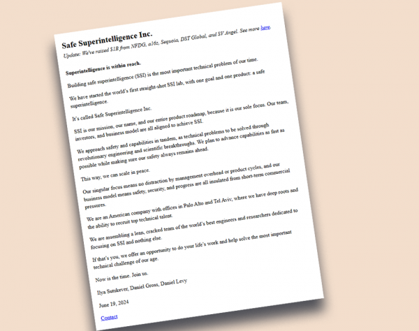 Η Safe Superintelligence (SSI) λειτουργεί όσο πιο μυστικά μπορεί από τα γραφεία της στη Silicon Valley και το Τελ Αβίβ ενώ ο λιτός ιστότοπός της περιέχει ελάχιστα περισσότερα από μια δήλωση μόλις 223 λέξεων.