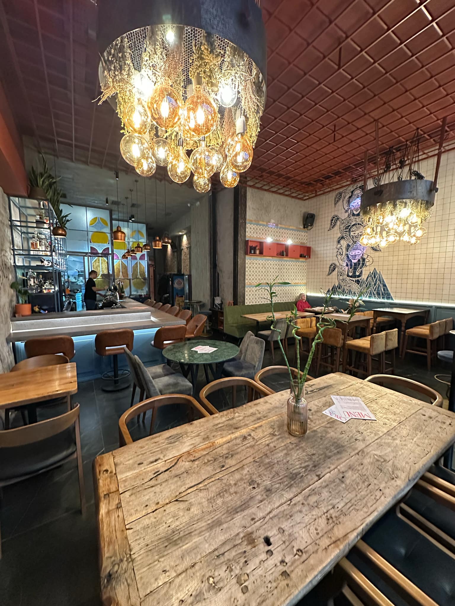 Ο χώρος στο επιβάλει. Σε αναγκάζει να βρεις τα στοιχεία της ιστορίας που διηγείται. Από τις τοιχογραφίες και τα custom made φωτιστικά που κρέμονται από το πλέγμα της οροφής με δερμάτινα λουριά, από αυτά που χρησιμοποιούνται στα άλογα – ειδική παραγγελία από την Κρήτη- και στα οποία, ανάμεσα στις λάμπες, κρέμονται αποξηραμένα βότανα, μέχρι τη γήινη χρωματική παλέτα που κινείται ανάμεσα στο κεραμιδί, το πράσινο, ένα βαθύ μπλε και με το γκρι του εμφανούς τσιμέντου σε κάποιους τοίχους που κι αυτό γήινο μοιάζει, σαν πέτρα, σαν βράχος, σαν βουνό· καμία σχέση με το industrial που έχουμε συνηθίσει. Σε κάνει να παρατηρείς και να αναρωτιέσαι. Και το φαγητό, το ίδιο κάνει. Και οι μουσικές επιλογές, και αυτές… Και ο Μαραντόνα με φωτοστέφανο στις ανδρικές τουαλέτες δίπλα στις ενωμένες γυναίκες. “Women United”.