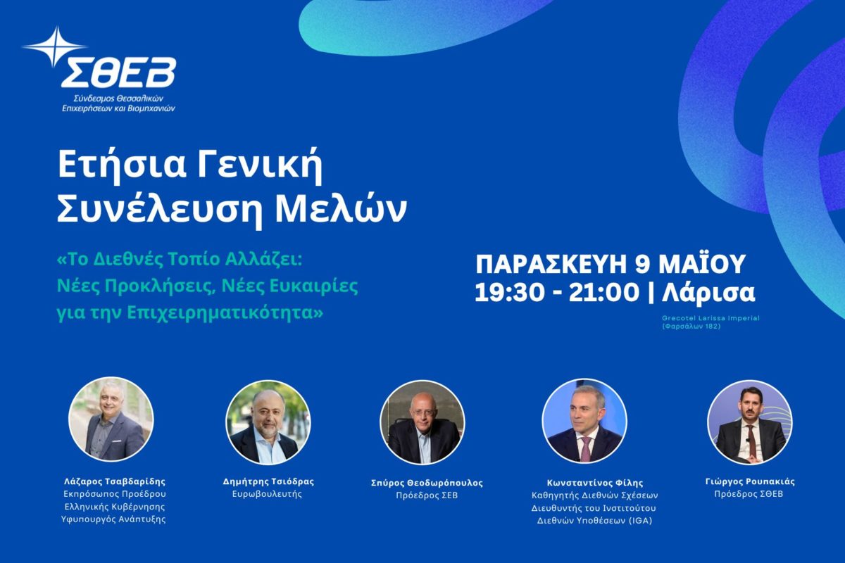 Ο Σύνδεσμος Θεσσαλικών Επιχειρήσεων και Βιομηχανιών (ΣΘΕΒ) διοργανώνει την Ετήσια Ανοικτή Γενική Συνέλευση των Μελών του, με κεντρικό θέμα: «Το Διεθνές Τοπίο Αλλάζει: Νέες Προκλήσεις, Νέες Ευκαιρίες για την Επιχειρηματικότητα», την Παρασκευή 9 Μαΐου 2025 και ώρα 19:30, στο ξενοδοχείο «Grecotel Larissa Imperial», στη Λάρισα.
