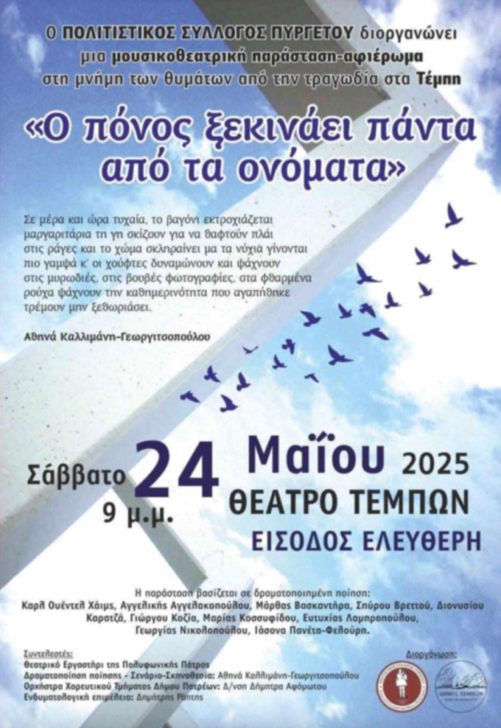 Μια μουσικοθεατρική παράσταση-αφιέρωμα στη μνήμη των θυμάτων από την τραγωδία στα Τέμπη