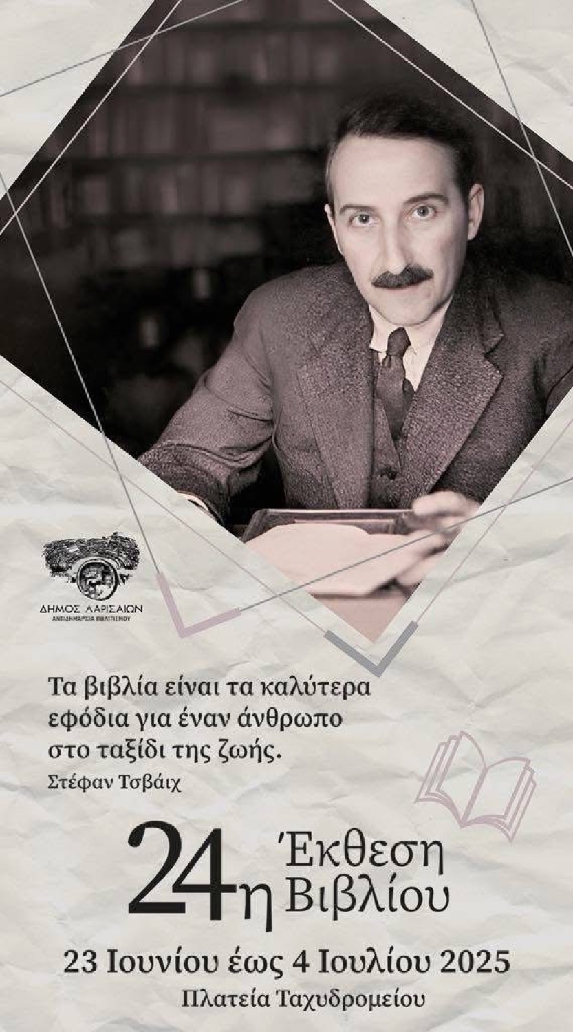 Τα βιβλιοπωλεία Άνεμος, Βιβλιογνώση, BLA BLA, Γραμμή, Καλτσάς, Πρίσμα, Παλαιοβιβλιοπωλείο διοργανώνουν τα εγκαίνια της 24ης Έκθεσης Βιβλίου Λάρισας, που θα πραγματοποιηθούν αύριο, Τρίτη 24 Ιουνίου, στις 20:30.