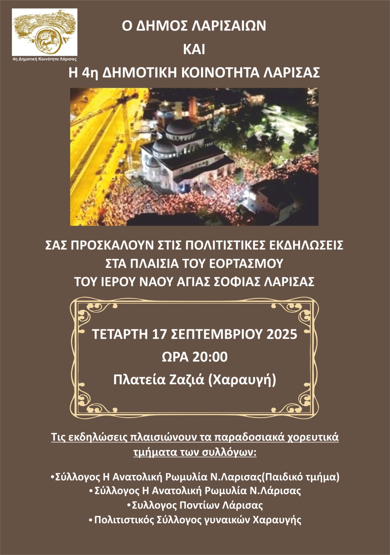 Πολιτιστικές εκδηλώσεις διοργανώνει η 4η Δημοτική Κοινότητα του Δήμου Λαρισαίων, στο πλαίσιο του εορτασμού του Ιερού ναού της Αγίας Σοφίας Λάρισας, την Τετάρτη 17 Σεπτεμβρίου στις 20:00 το βράδυ.