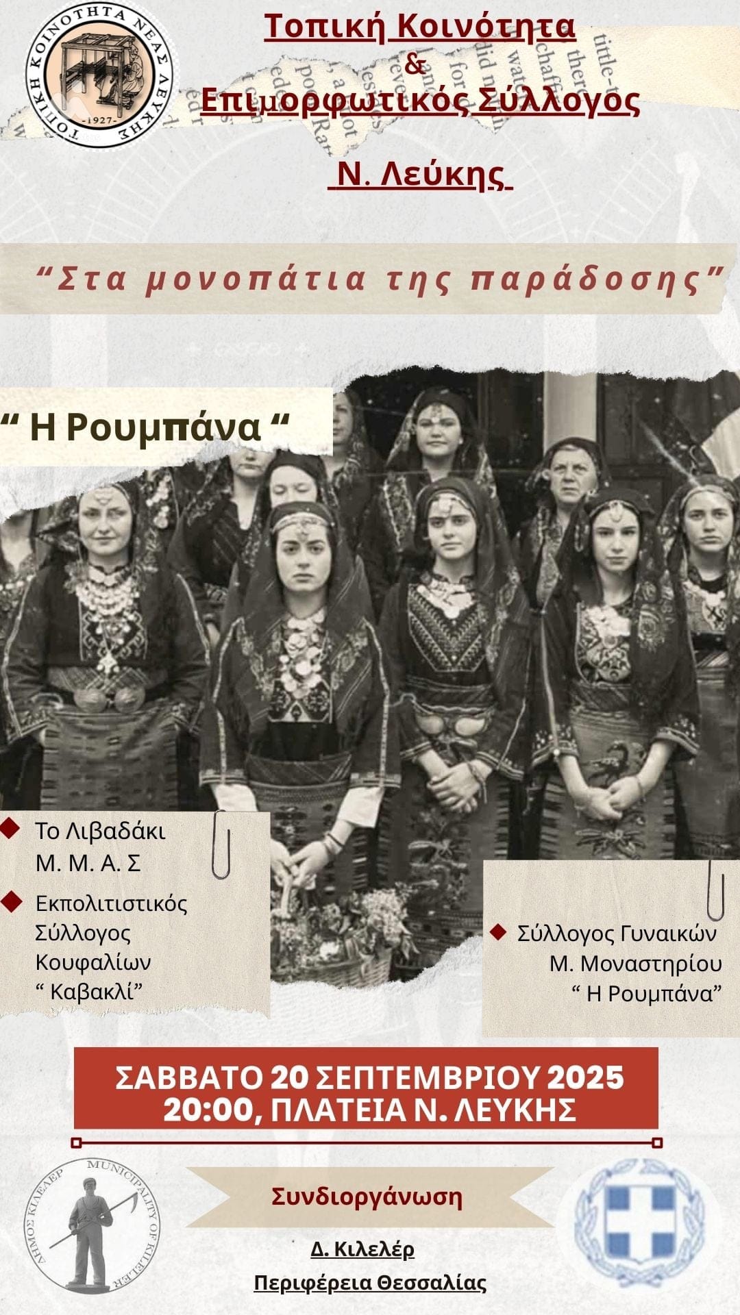 Σάββατο 20 Σεπτεμβρίου στις 20:00 στην πλατεία της Νέας Λεύκης: «Στα μονοπάτια της παράδοσης». Η τοπική κοινότητα και ο επιμορφωτικός σύλλογος διοργανώνουν το έθιμο της «Ρουμπάνας».