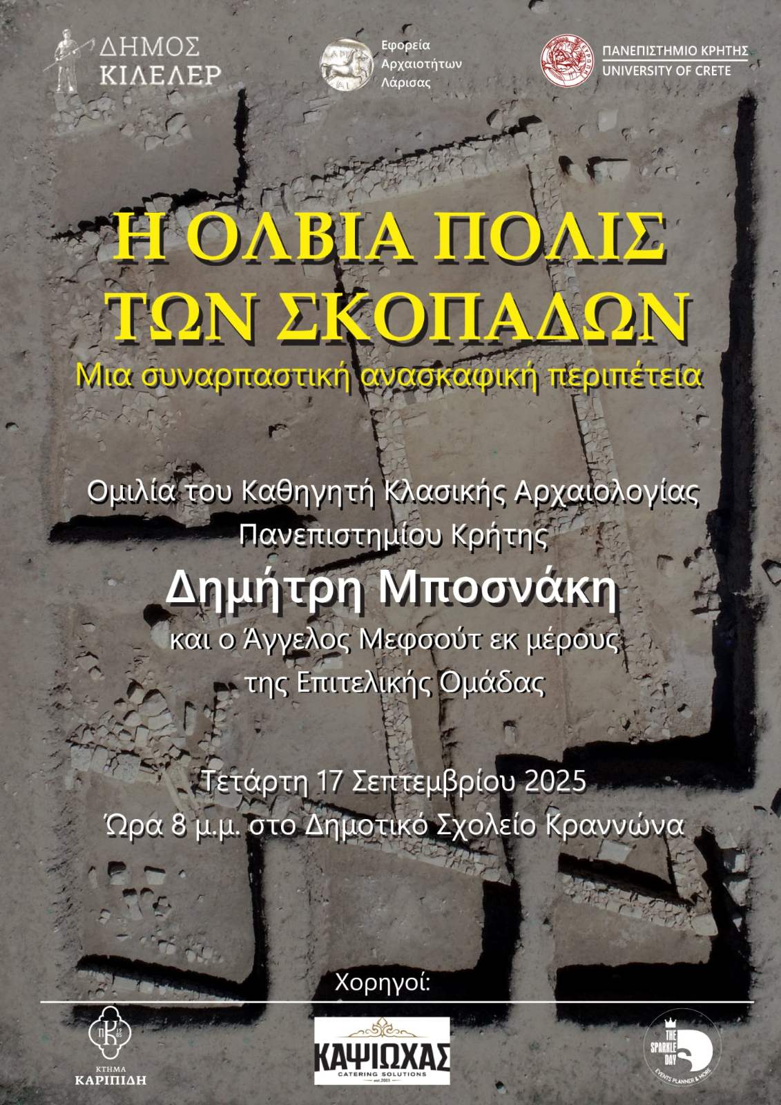 Τετάρτη 17 Σεπτεμβρίου στις 20:00 στο Δημοτικό σχολείο Κραννώννα.: «Η όλβιος πόλις των Σκοπάδων», μια συναρπαστική ανασκαφική εμπειρία. Ομιλία του καθηγητή κλασικής αρχαιολογίας του Πανεπιστημίου Κρήτης Δημήτρη Μποσνάκη και του Άγγελου Μεφσούτ εκ μέρους της επιτελικής ομάδας σχετικά με την πρόοδο των ανασκαφών στην αρχαία Κραννώνα.