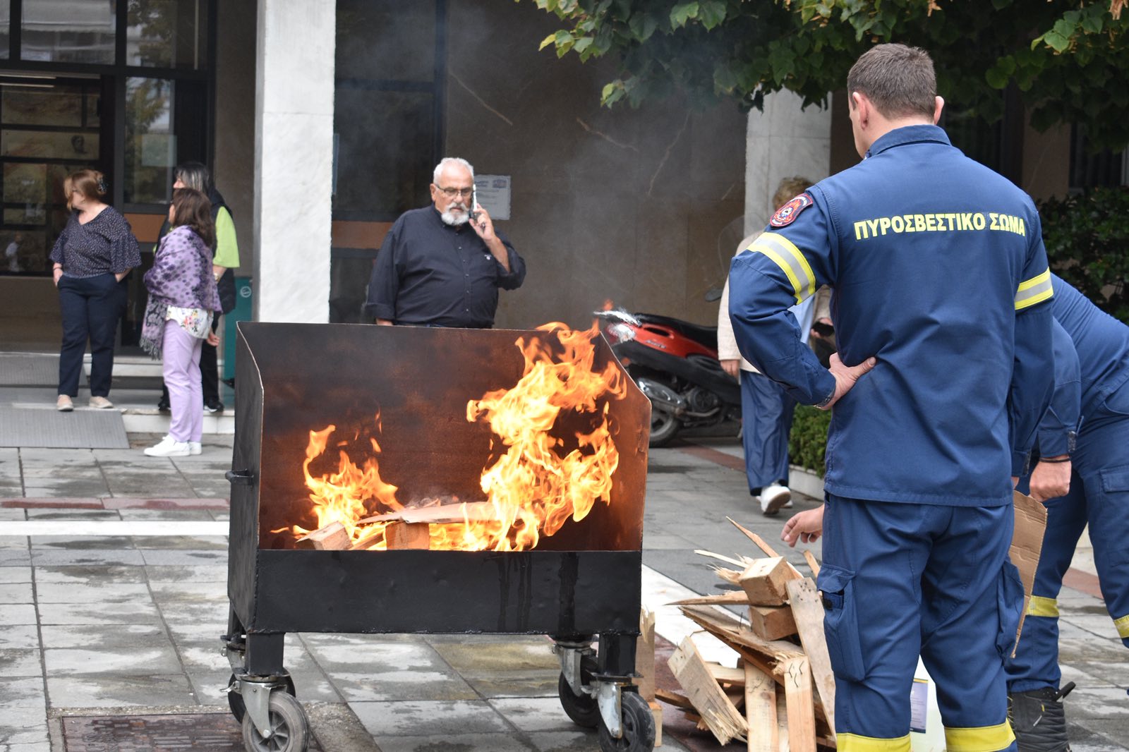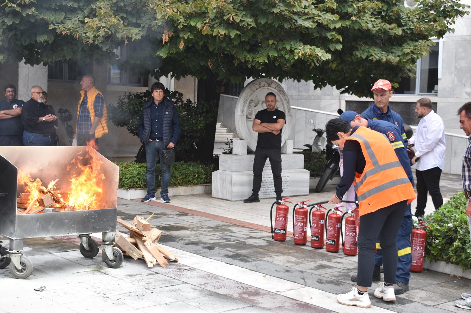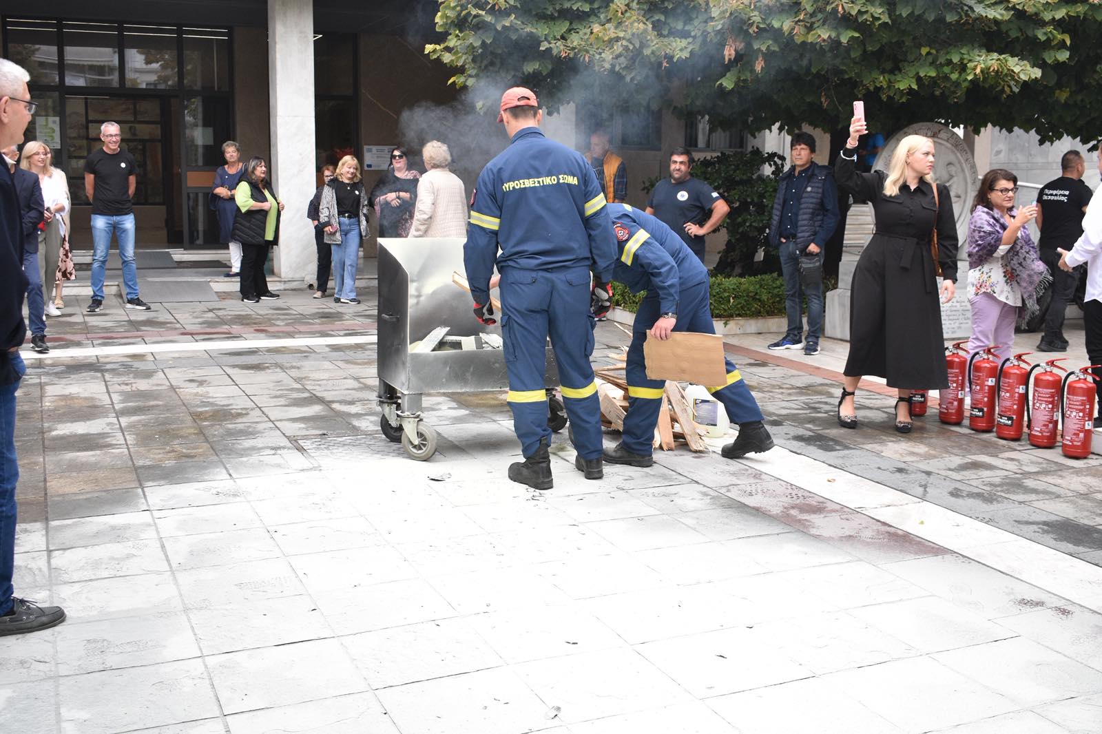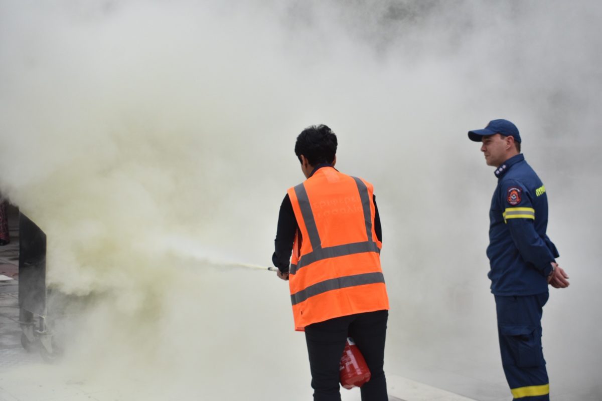 Στον εξωτερικό χώρο του κτιρίου πραγματοποιήθηκε άναμμα ελεγχόμενης φωτιάς, ενώ στη συνέχεια έγινε επίδειξη κατάσβεσης με φορητούς πυροσβεστήρες. Στελέχη της Πυροσβεστικής Υπηρεσίας εξήγησαν τη σωστή χρήση των μέσων πυρόσβεσης, δίνοντας παράλληλα τη δυνατότητα σε εργαζόμενους να συμμετάσχουν πρακτικά στην άσκηση.