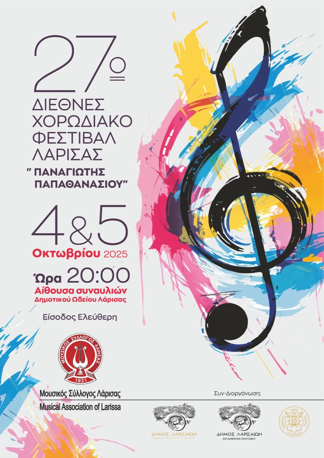 Tο 27ο Διεθνές Χορωδιακό Φεστιβάλ Λάρισας «Παναγιώτης Παπαθανασίου», υποδέχεται η Λάρισα, το Σαββατοκύριακο 4 & 5 Οκτωβρίου 2025, στις 20:00, στην αίθουσα συναυλιών του Δημοτικού Ωδείου Λάρισας, με ελεύθερη είσοδο για το κοινό. Μία διοργάνωση που έχει πλέον καθιερωθεί ως θεσμός υψηλού πολιτιστικού κύρους τέσσερις δεκαετίες μετά την πρώτη διοργάνωση το 1985.