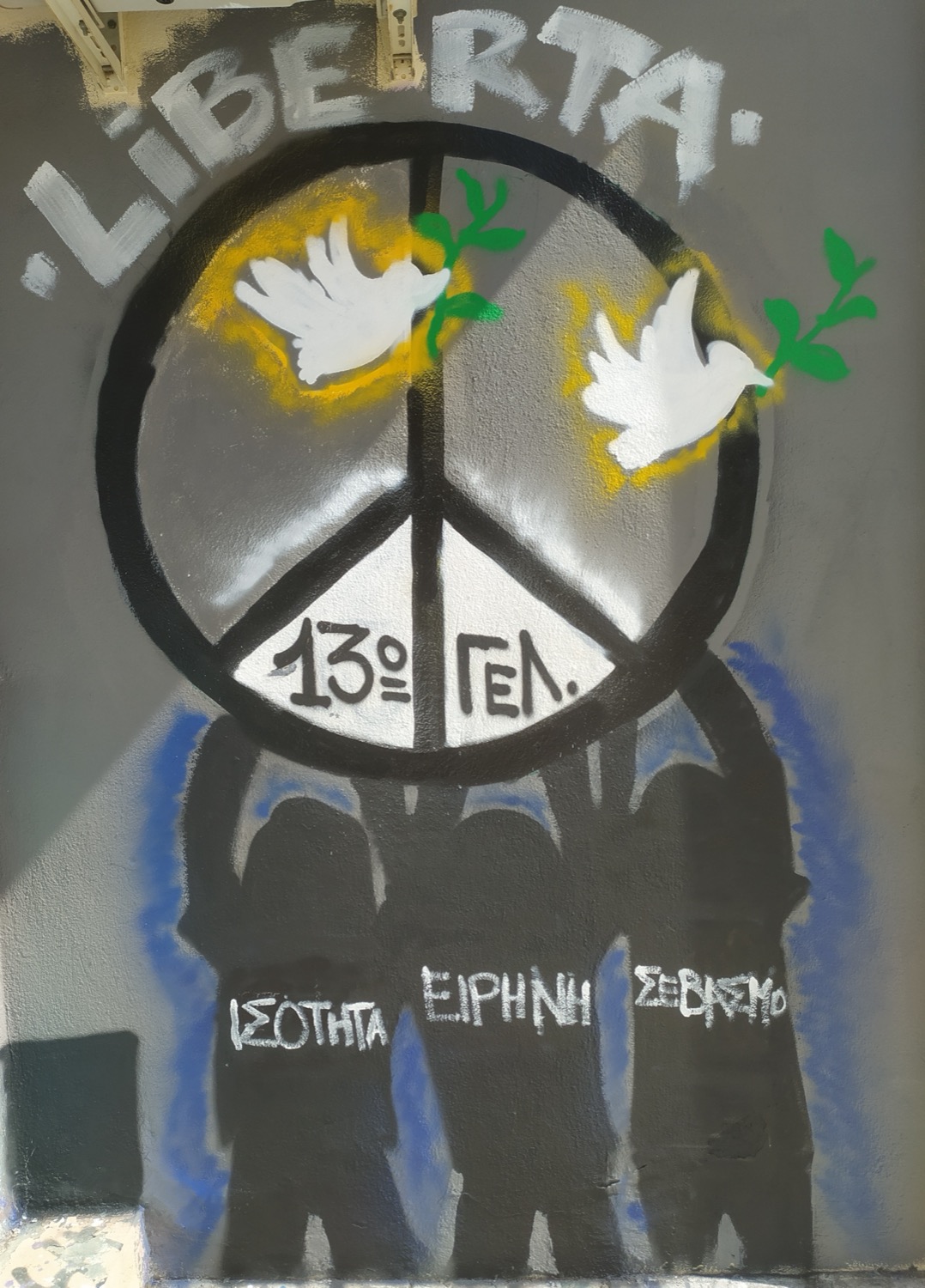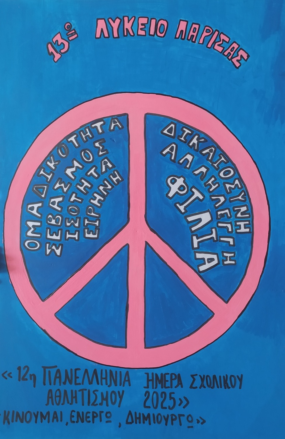 Οι μαθητές/τριες επίσης, προσέγγισαν το θέμα της ΕΙΡΗΝΗΣ και εικαστικά. Εξέφρασαν και αποτύπωσαν τα μηνύματά τους για την ΕΙΡΗΝΗ δημιουργώντας πανό και σχετική τοιχογραφία στον χώρο του σχολείο, συμμετέχοντας έτσι στη διαδικασία βράβευσης για τις σχολικές μονάδες που θα πάρουν μέρος στην Πανελλαδική Σχολική Σκυταλοδρομία 2025 «Τρέχω για την ΕΙΡΗΝΗ» και υπενθυμίζοντας ότι η ΕΙΡΗΝΗ είναι το μεγαλύτερο αγαθό για όλους τους λαούς του κόσμου!