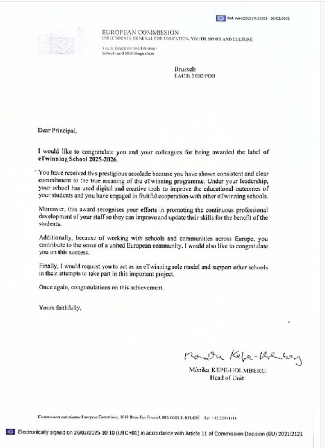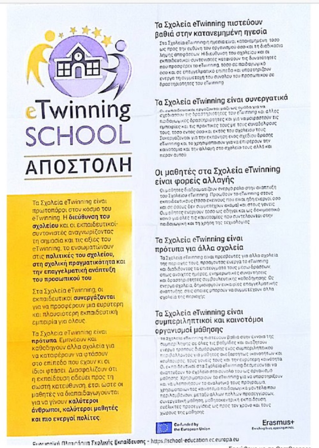 Ένα «eTwinning School» είναι εκείνο που έχει διακριθεί σε ευρωπαϊκό επίπεδο για τη συστηματική του συμμετοχή στο πρόγραμμα eTwinning. Το σχολείο μας ευχαριστεί την Ευρωπαϊκή Επιτροπή για τη βράβευσή του και είναι έτοιμο και πρόθυμο να συμμετάσχει σε ένα αναπτυξιακό ταξίδι με δραστηριότητες που μπορούν να αξιολογηθούν με αντικειμενικά κριτήρια.