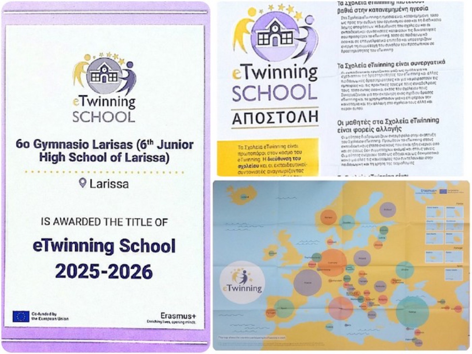 Αναγνωρίστηκε με την απονομή της ετικέτας «eTwinning School» από το eTwinning η συμμετοχή, η δέσμευση και η αφοσίωση της ομάδας των eTwinners του σχολείου μας-6ο Γυμνάσιο Λάρισας, αλλά και συνολικά του σχολείου μας, όπου συνεργάζονται ομάδες εκπαιδευτικών με τον συντονισμό και την καθοδήγηση του Διευθυντή του σχολείου μας κ. Παπαμαργαρίτη Βασιλείου (ΠΕ06 και ΠΕ80).