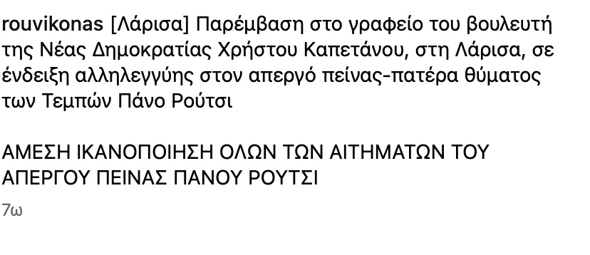 Όπως οι ίδιοι ανέφεραν σε ανάρτηση στα μέσα κοινωνικής δικτύωσης λίγο μετά, ήταν «παρέμβαση στο γραφείο του βουλευτή της Νέας Δημοκρατίας Χρήστου Καπετάνου, στη Λάρισα, σε ένδειξη αλληλεγγύης στον απεργό πείνας-πατέρα θύματος των Τεμπών Πάνο Ρούτσι. Άμεση ικανοποίηση όλων των αιτημάτων του απεργού πείνας Πάνου Ρούτσι».