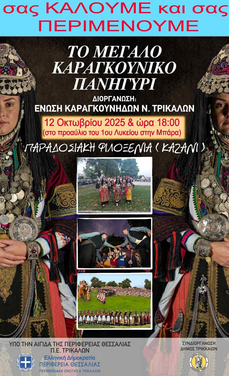 Η μεγάλη γιορτή της παράδοσης και της πολιτιστικής κληρονομιάς των Καραγκούνηδων επιστρέφει δυναμικά! Μετά την αρχική αναβολή, ορίστηκε νέα ημερομηνία για τη διεξαγωγή του Μεγάλου Καραγκούνικου Πανηγυριού, το οποίο θα πραγματοποιηθεί την Κυριακή 12 Οκτωβρίου 2025, στις 18:00, στο προαύλιο του 1ου Λυκείου Τρικάλων (Μπάρα).