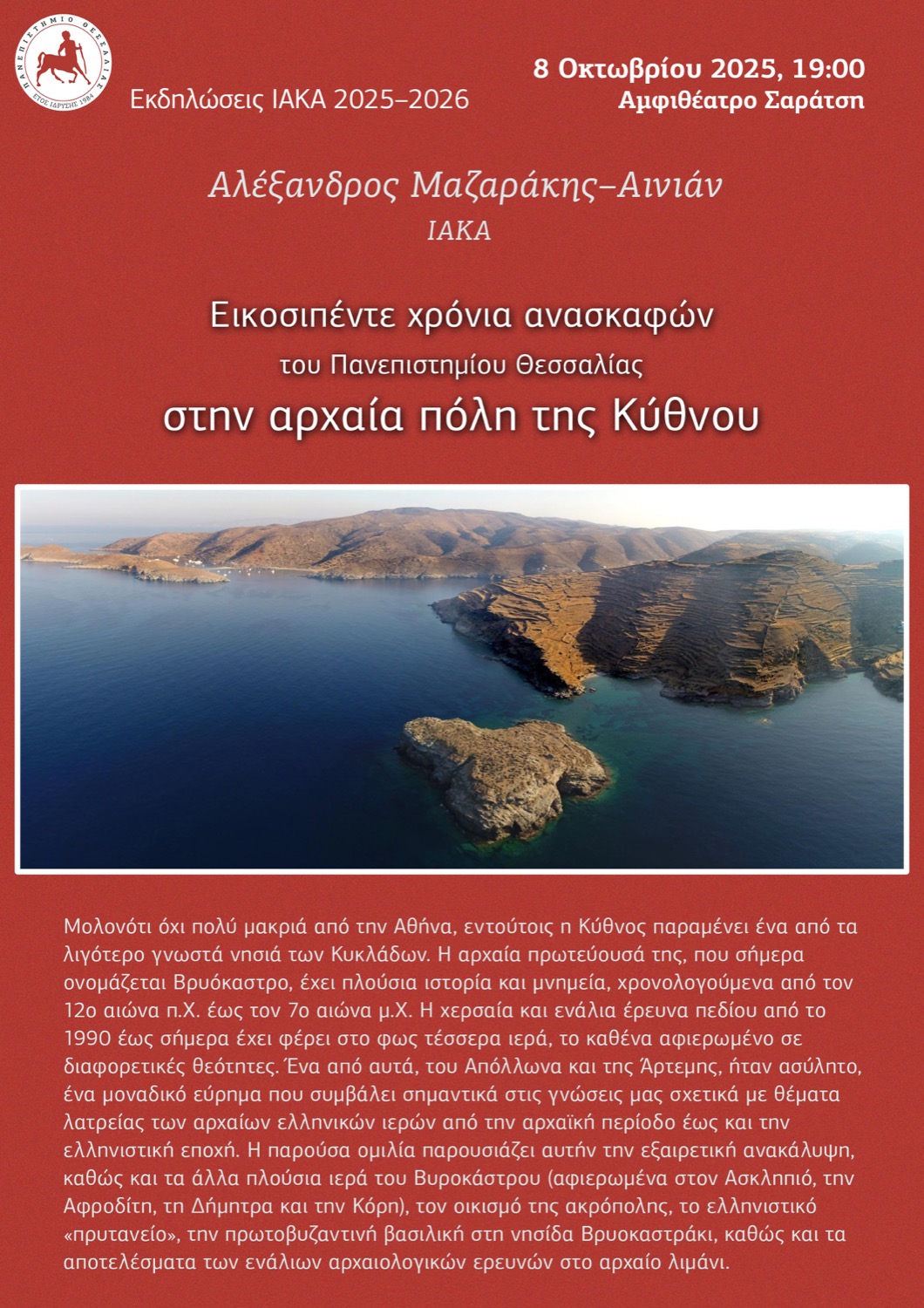 Η εναρκτήρια διάλεξη του προγράμματος μεταπτυχιακών σπουδών “Αρχαιολογία πεδίου και υλικός πολιτισμός” του ΙΑΚΑ πραγματοποιείται στο Αμφιθέατρο Σαράτση, την Τετάρτη 8 Οκτωβρίου 2025 και ώρα 19:00. Θα μιλήσει ο Αλέξανδρος Μαζαράκης Αινιάν με θέμα “Εικοσιπέντε χρόνια ανασκαφών του Πανεπιστημίου Θεσσαλίας στην αρχαία πόλη της Κύθνου”.