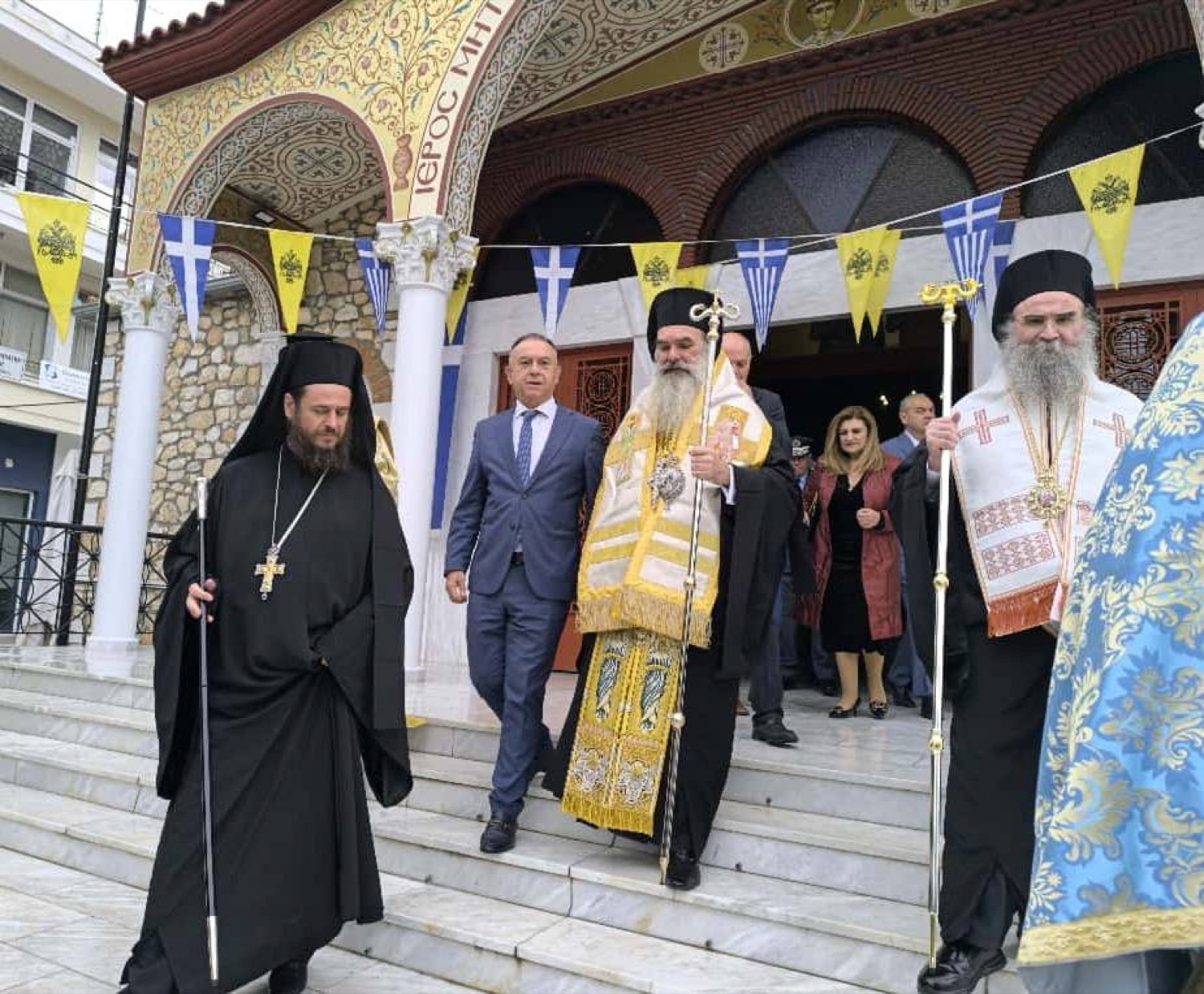 Μετά την Πανηγυρική Θεία Λειτουργία στον Ιερό Μητροπολιτικό Ναό του Αγίου Δημητρίου, προεξάρχοντος του Επισκόπου Αμφιπόλεως κ. Χριστοφόρου, συγχοροστατούντος του Σεβασμιωτάτου Μητροπολίτου Ελασσόνας κ. Χαρίτωνα, ακολούθησε κατάθεση στεφάνων στο Ηρώο της πόλης, με τον Υφυπουργό να αποτίει φόρο τιμής στους ήρωες που θυσιάστηκαν για την ελευθερία της πατρίδας.