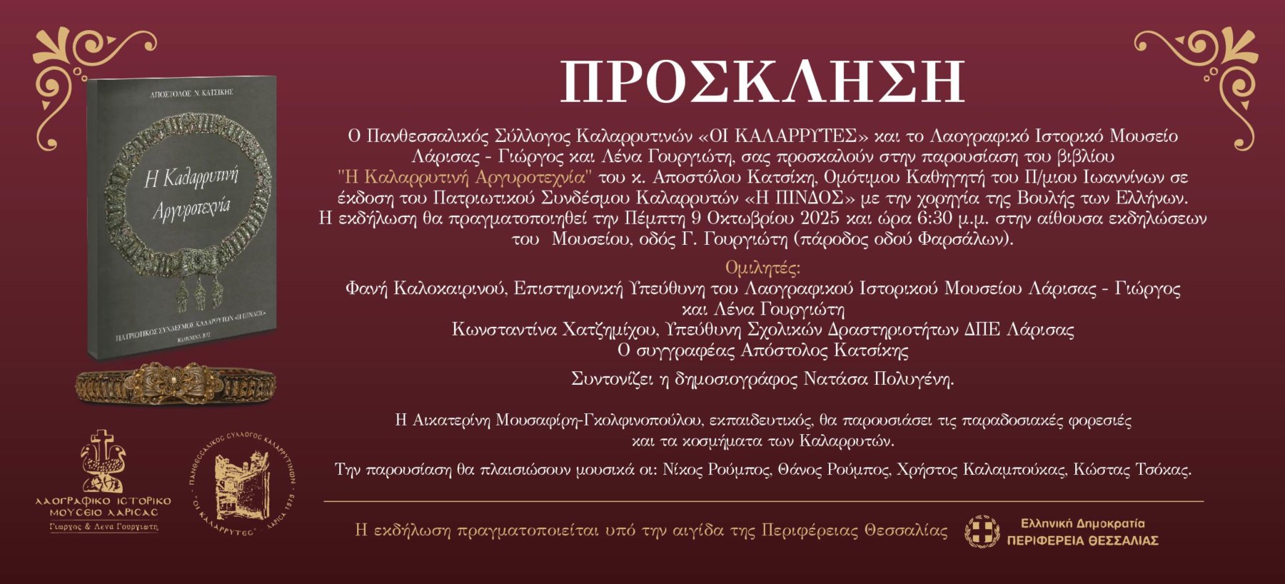 Ο Πανθεσσαλικός Σύλλογος Καλαρρυτινών «ΟΙ ΚΑΛΑΡΡΥΤΕΣ» και το Λαογραφικό Ιστορικό Μουσείο Λάρισας – Γιώργος και Λένα Γουργιώτη, παρουσιάζουν το βιβλίο του Καλαρρυτινού κ. Αποστόλου Κατσίκη, Ομότιμου Καθηγητή του Πανεπιστημίου Ιωαννίνων, με τίτλο «Η Καλαρρυτινή Αργυροτεχνία».