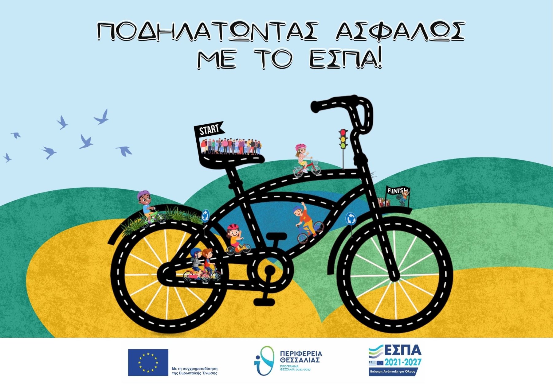 Το «Ποδηλατώντας ΑΣΦΑΛΩΣ με το ΕΣΠΑ» είναι ένα εκπαιδευτικό πρόγραμμα της Περιφέρεια Θεσσαλίας με την συνδρομή της Ειδικής Υπηρεσίας Διαχείρισης και την συνεργασία της Περιφερειακής Διεύθυνσης Εκπαίδευσης Θεσσαλίας, το οποίο σχεδιάστηκε για να ενημερώσει τα παιδιά για τη βιώσιμη ανάπτυξη και την ασφαλή κυκλοφορία με ποδήλατο, εξηγώντας πώς τα ευρωπαϊκά κονδύλια του Προγράμματος συμβάλλουν σε αυτό.
