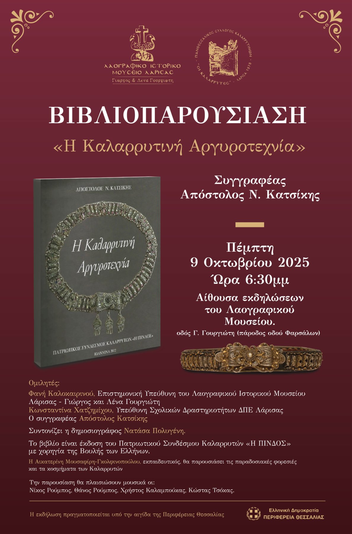 Ο Πανθεσσαλικός Σύλλογος Καλαρρυτινών «ΟΙ ΚΑΛΑΡΡΥΤΕΣ», σε συνεργασία με το Λαογραφικό Ιστορικό Μουσείο Λάρισας – Γιώργος και Λένα Γουργιώτη, διοργανώνει εκδήλωση παρουσίασης του βιβλίου του κ. Αποστόλου Κατσίκη, Ομότιμου Καθηγητή του Πανεπιστημίου Ιωαννίνων, με τίτλο: «Η Καλαρρυτινή Αργυροτεχνία»