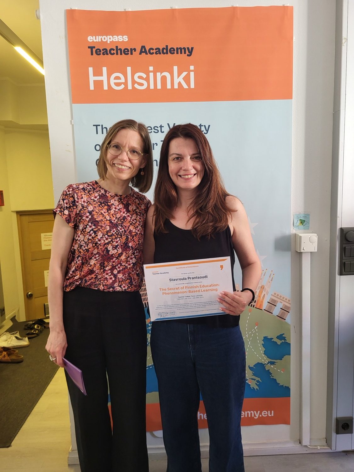 Παράλληλα, η Διευθύντρια του σχολείου, κα Πραντσούδη Σταυρούλα (ΠΕ86-Πληροφορικός), συμμετείχε στο καινοτόμο σεμινάριο “The Secret of Finnish Education: Phenomenon-Based Learning”, στο οποίο αναλύθηκε σε βάθος η φινλανδική προσέγγιση στη μάθηση και η γενικότερη κουλτούρα της σχολικής εκπαίδευσης στη Φινλανδία, χώρα που αναγνωρίζεται διεθνώς για τα εξαιρετικά εκπαιδευτικά της αποτελέσματα. Με επίκεντρο τη βασισμένη-σε-φαινόμενα εκπαίδευση (Phenomenon-Based Learning), η οποία προάγει τη διεπιστημονική διερεύνηση και τη σύνδεση της σχολικής γνώσης με την πραγματικότητα, οι εκπαιδευόμενοι μελέτησαν πώς σχεδιάζεται ένα πρόγραμμα που βασίζεται σε πραγματικά φαινόμενα αντί για παραδοσιακά θεματικά πεδία, πώς ενισχύεται η αυτενέργεια των μαθητών/τριών και πώς ενσωματώνεται η τεχνολογία ως εργαλείο κριτικής σκέψης και δημιουργικότητας, και όχι ως απλό μέσο μετάδοσης πληροφοριών.