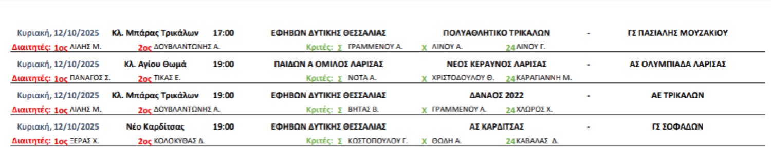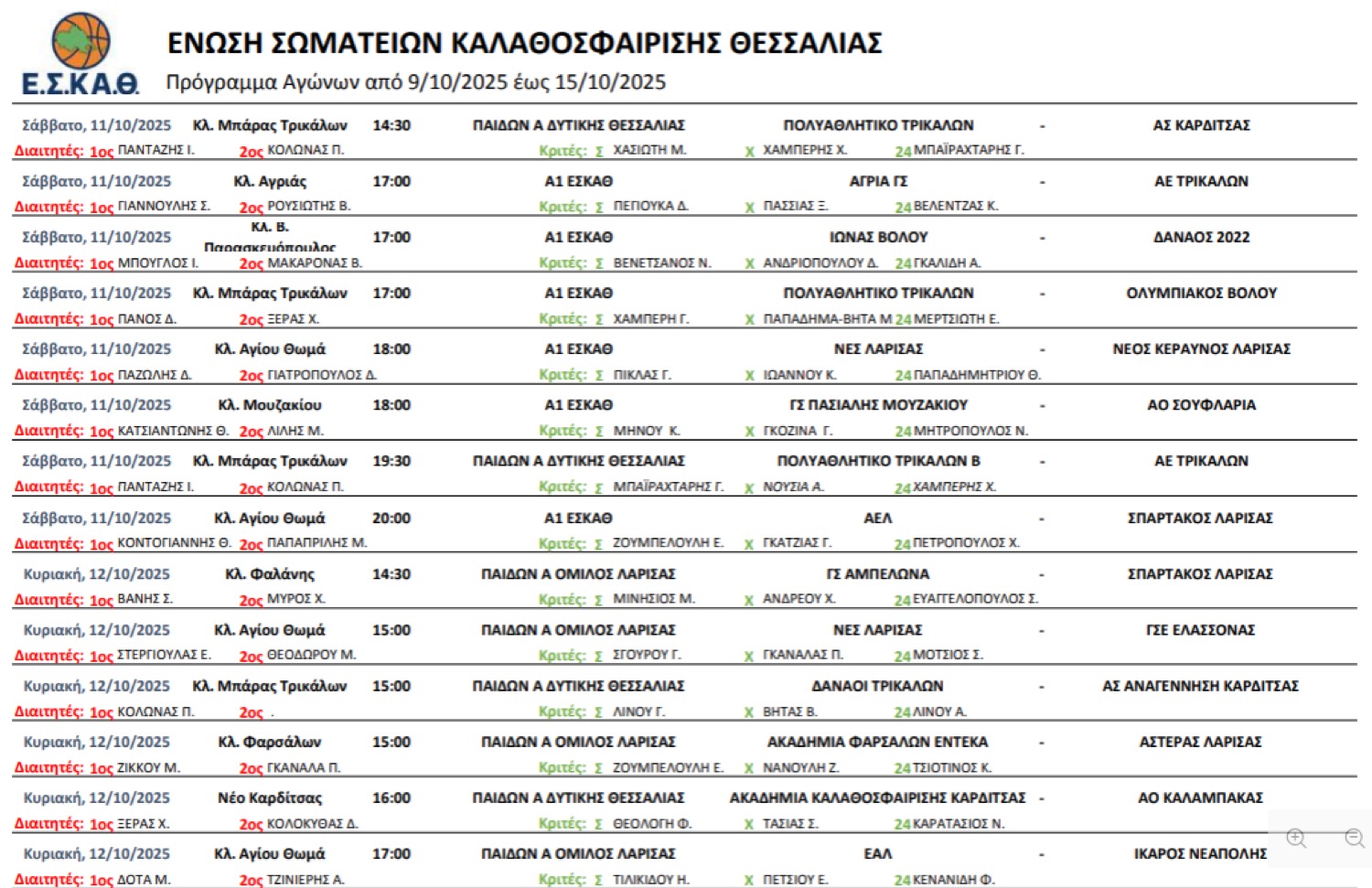 Η Ένωση Σωματείων Καλαθοσφαίρισης Θεσσαλίας ανακοίνωσε τους διαιτητές για την ερχόμενη αγωνιστική της Α1, των Εφήβων, αλλά και των Παίδων.