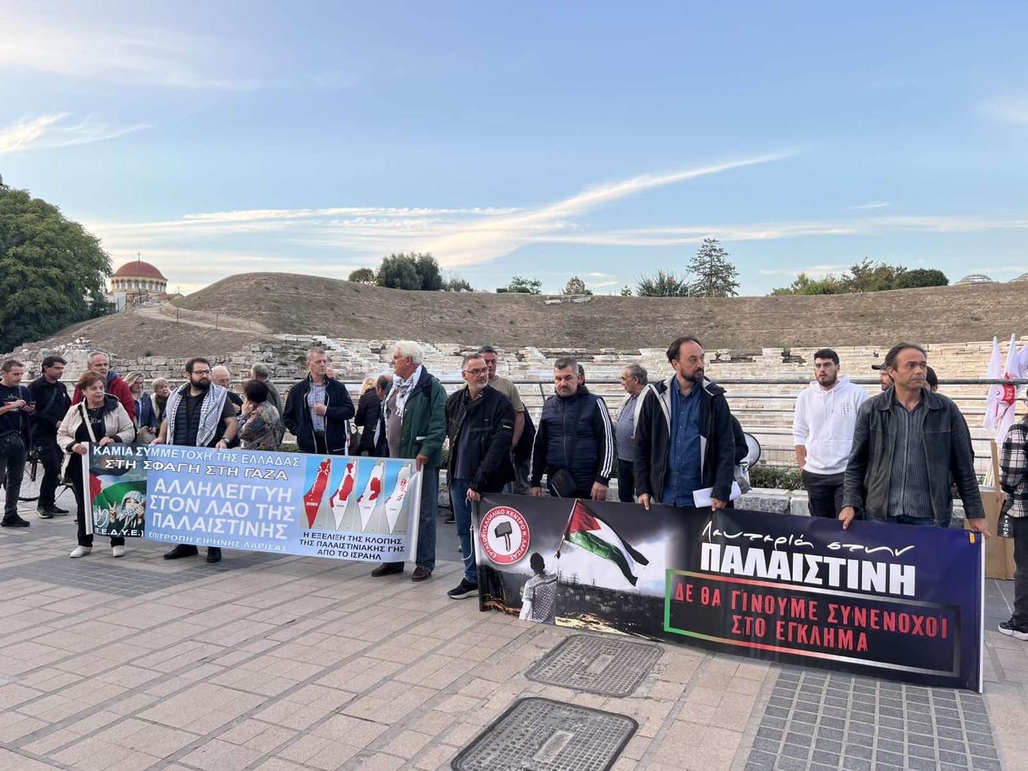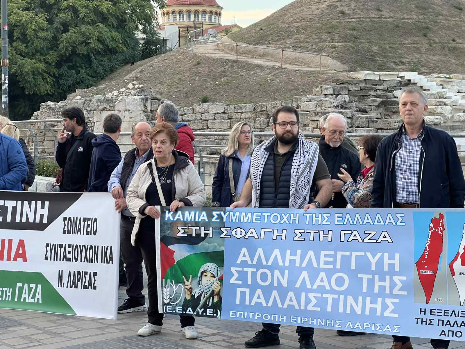 Πλήθος κόσμου συγκεντρώθηκε, απόγευμα Παρασκευής, στην πικετοφορία μπροστά στο Α΄ Αρχαίο Θέατρο, ανταποκρινόμενοι στο κάλεσμα του Εργατικού Κέντρου Ν. Λάρισας και της Επιτροπή Ειρήνης Λάρισας (μέλος ΕΕΔΥΕ). Η κινητοποίηση έγινε για να καταγγελθεί η στρατιωτική επίθεση του Ισραήλ στη Γάζα, να εκφραστεί αλληλεγγύη προς τον παλαιστινιακό λαό και να απαιτηθούν άμεσα μέτρα για παύση των βομβαρδισμών, παροχή ανθρωπιστικής βοήθειας και διεθνής αναγνώριση παλαιστινιακού κράτους.