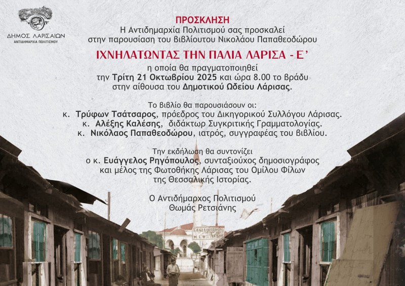 Παρουσιάζεται στη Λάρισα ο Ε΄ τόμος της σειράς βιβλίων του Νικολάου Παπαθεοδώρου ΙΧΝΗΛΑΤΩΝΤΑΣ ΤΗΝ ΠΑΛΙΑ ΛΑΡΙΣΑ – Ε’ την Τρίτη 21 Οκτωβρίου 2025 και ώρα 8:00 το βράδυ στο Δημοτικό Ωδείο Λάρισας.