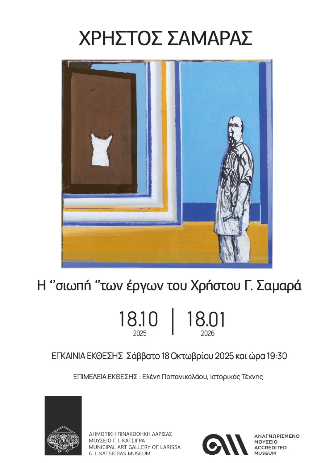 Το Σάββατο 18 Οκτωβρίου 2025 και ώρα 19:30 στην αίθουσα «Ειρήνης Κατσίγρα» θα εγκαινιαστεί από τον δήμαρχο Λαρισαίων και πρόεδρο του διοικητικού συμβουλίου, κ. Αθανάσιο Μαμάκο η έκθεση ‘‘Η «σιωπή» των έργων του Χρήστου Γ. Σαμαρά’’, σε επιμέλεια της ιστορικού τέχνης Ελένης Παπανικολάου.