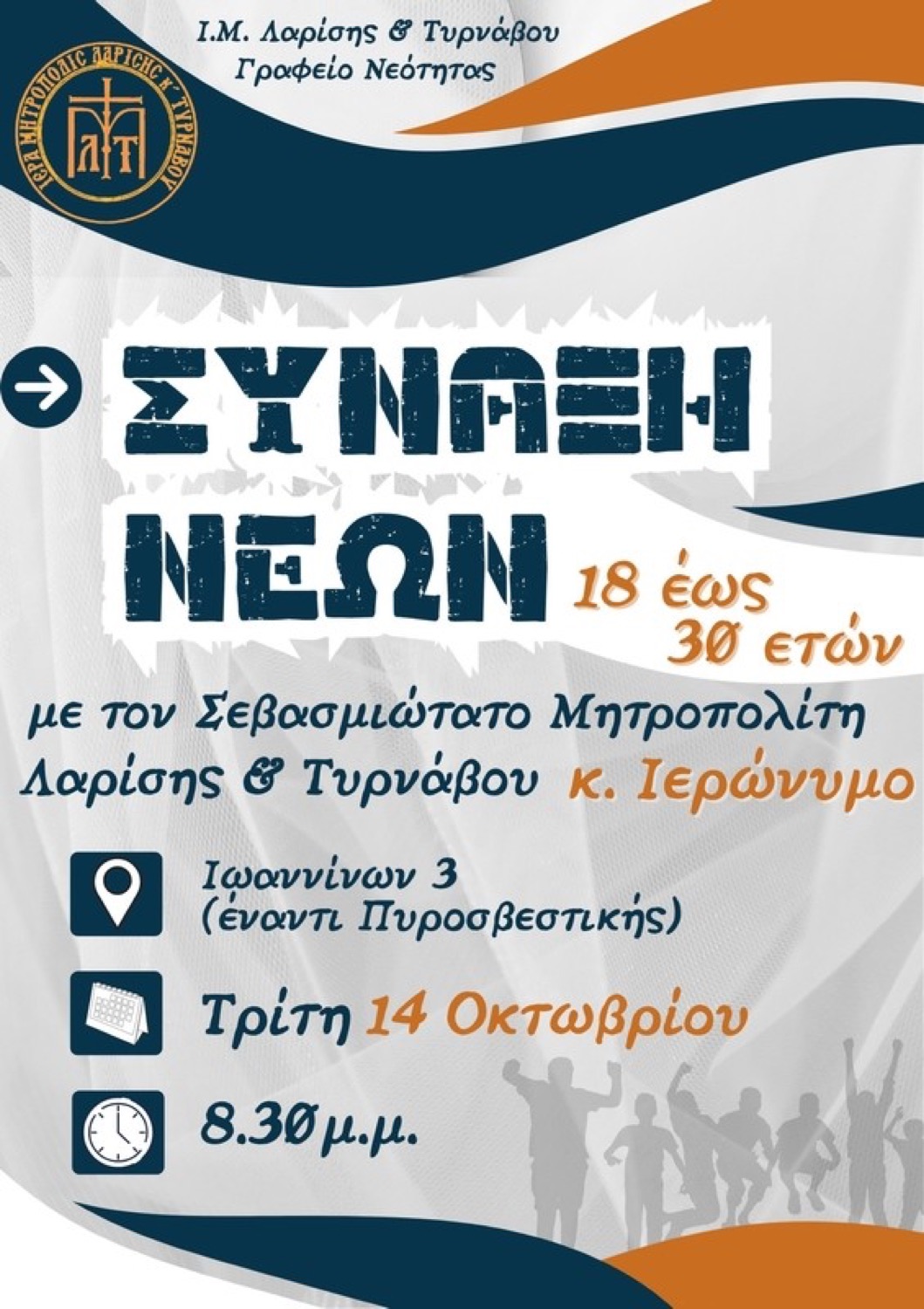 Την Τρίτη 14 Οκτωβρίου 2025, και ώρα 8:30 το απόγευμα, στο Επισκοπείο της Ιεράς Μητροπόλεως Λαρίσης και Τυρνάβου (Ιωαννίνων 3, έναντι πυροσβεστικής), ξεκινούν οι συνάξεις νέων.