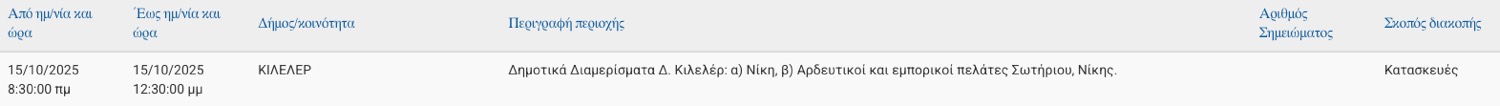 Σύμφωνα με ανακοίνωση της ΔΕΔΔΗΕ αναμένεται να υπάρξουν διακοπές ρεύματος σήμερα, πρωί της Τετάρτης, σε περιοχές του Δήμου Κιλελέρ λόγω της τέλεσης εργαιών.