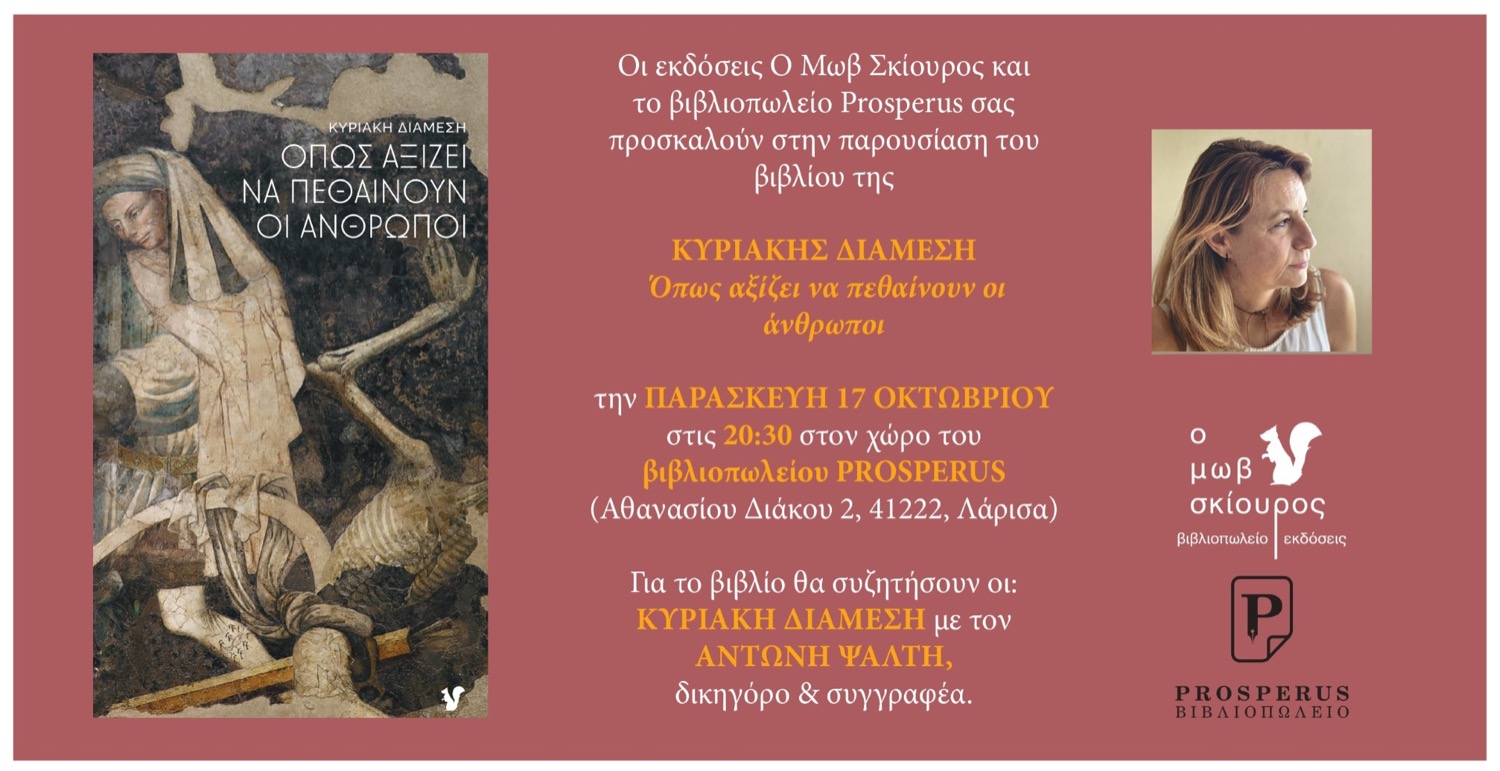 Οι εκδόσεις Ο Μωβ Σκίουρος και το βιβλιοπωλείο Prosperus διοργανώνουν την Παρασκευή 17 Οκτωβρίου, στις 20:30, την παρουσίαση του βιβλίου της Κυριακής Διάμεση με τίτλο «Όπως αξίζει να πεθαίνουν οι άνθρωποι».