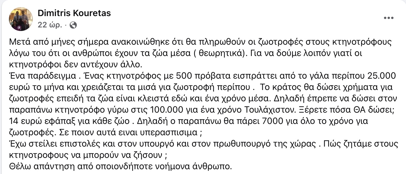 Σκληρή ανάρτηση Κουρέτα κατά κυβέρνησης για κτηνοτρόφους: «Πώς τους ζητάμε να μπορέσουν να ζήσουν…;»
