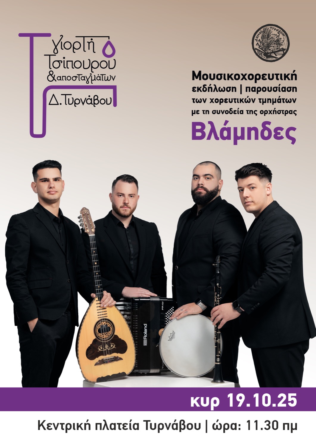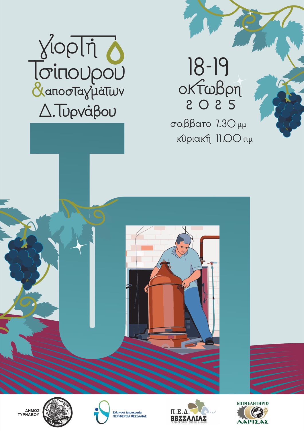 Στις 18 και 19 Οκτωβρίου 2025 θα πραγματοποιηθεί η Γιορτή Τσίπουρου και Αποσταγμάτων στον Τύρναβο. Την εκδήλωση διοργανώνει ο Δήμος Τυρνάβου σε συνδιοργάνωση με την Περιφέρεια Θεσσαλίας, την ΠΕΔ Θεσσαλίας και το Επιμελητήριο Λάρισας.