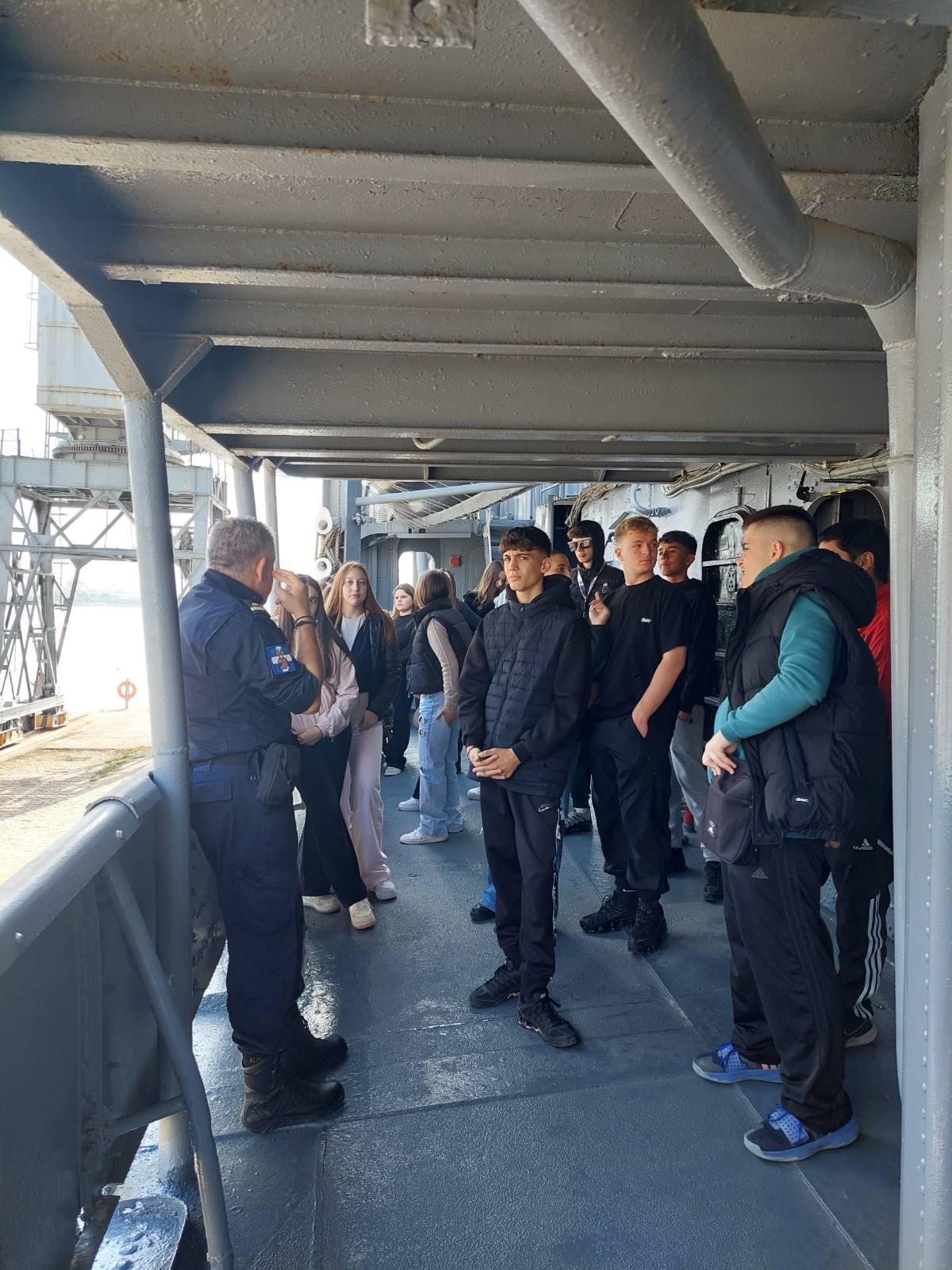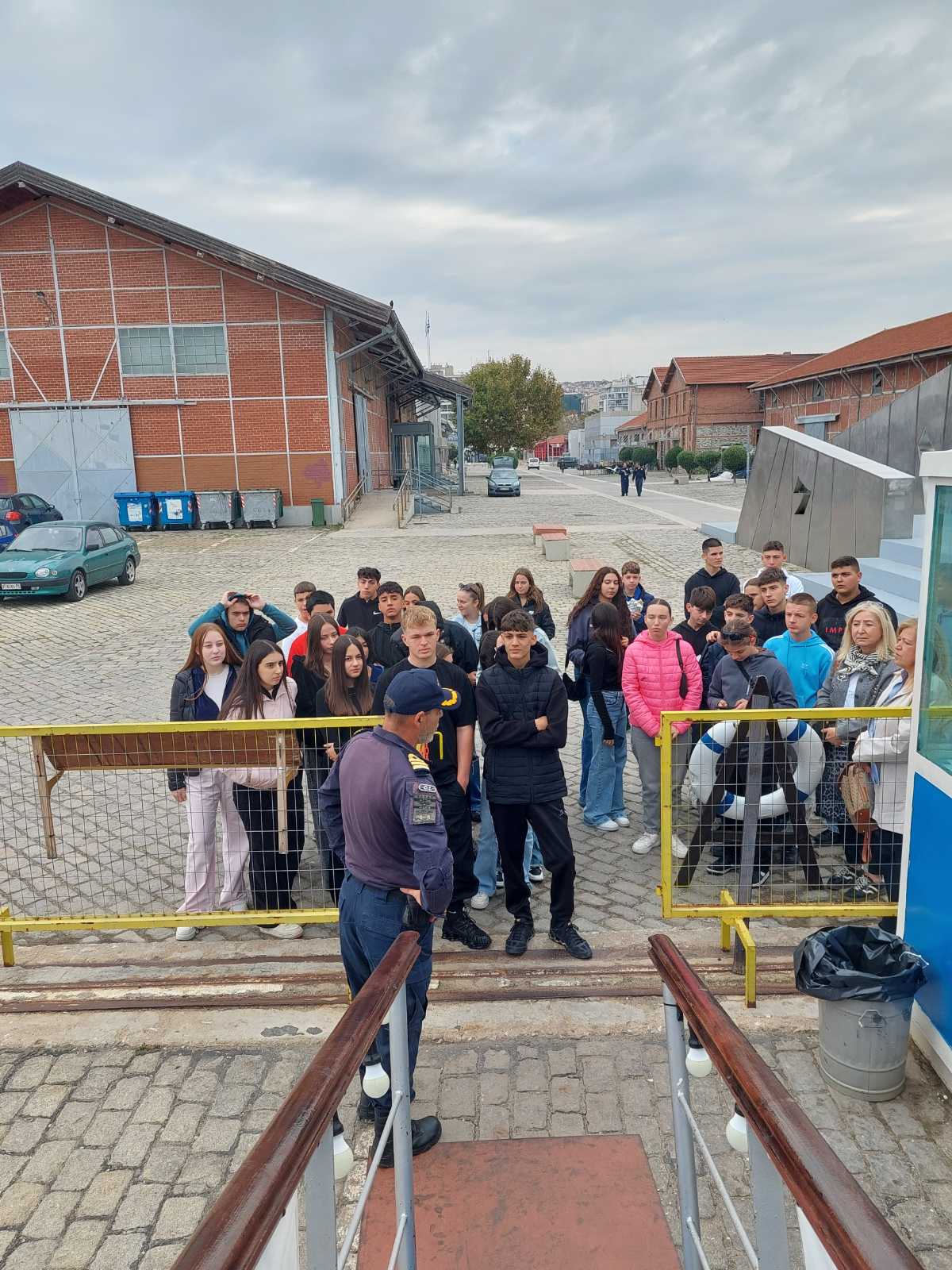 Κατά τη διάρκεια της επίσκεψης, οι μαθητές είχαν την ευκαιρία να περιηγηθούν στους χώρους του πλοίου και να γνωρίσουν από κοντά την πλούσια ιστορία του. Το Α/Τ «Βέλος» καθελκύστηκε το 1942 στα ναυπηγεία της Βοστώνης και εντάχθηκε το 1943 στο Πολεμικό Ναυτικό των ΗΠΑ, συμμετέχοντας ενεργά στον Ειρηνικό Ωκεανό κατά τον Β’ Παγκόσμιο Πόλεμο.