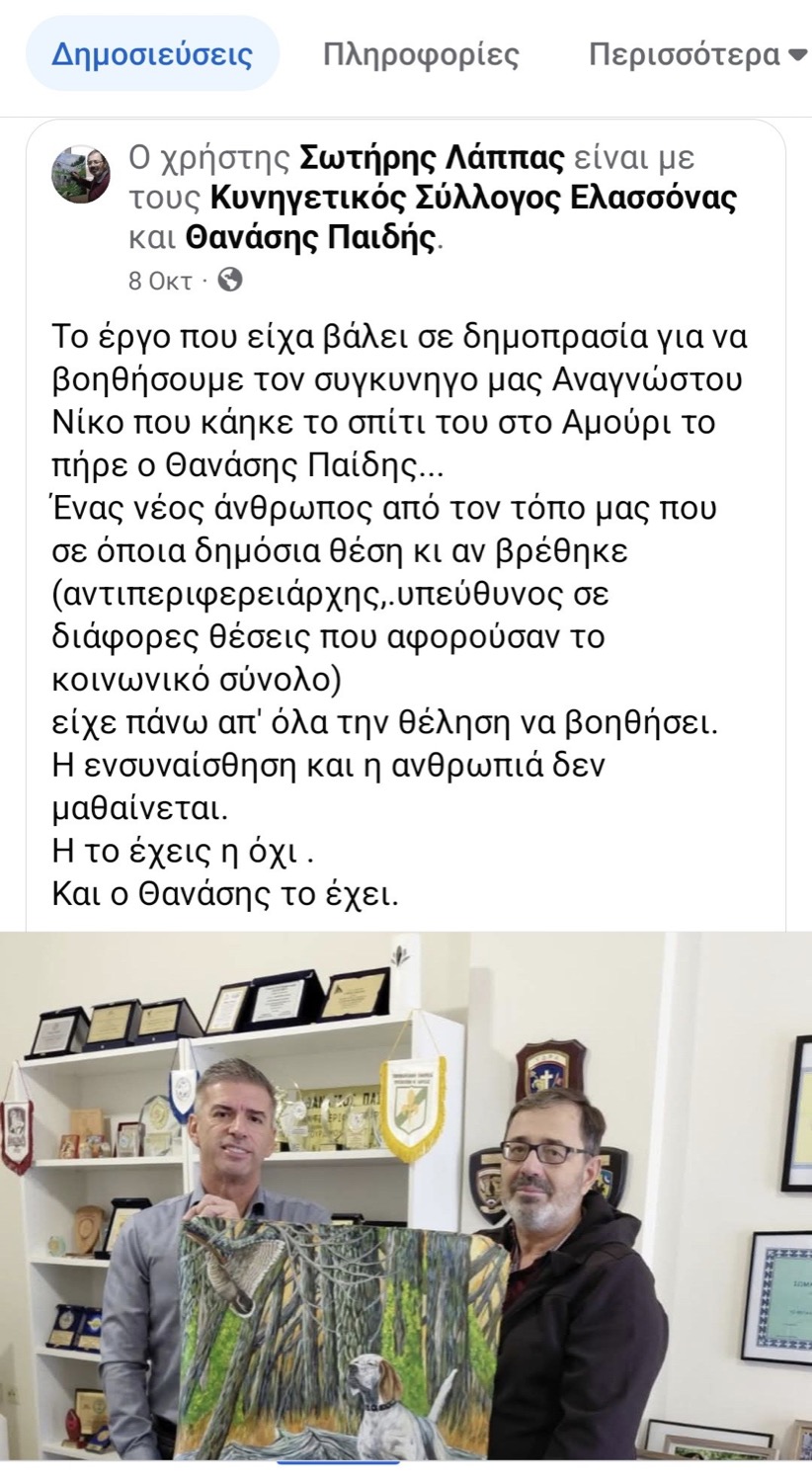 Σε μια συγκινητική ανάρτηση προέβη ο γνωστός καλλιτέχνης Σωτήρης Λάππας για την κίνηση του Σάκη Παιδή να στηρίξει την πυρόπληκτη οικογένεια του Νίκου Αναγνώστου, της οποίας το σπίτι στο Αμούρι κάηκε ολοσχερώς.