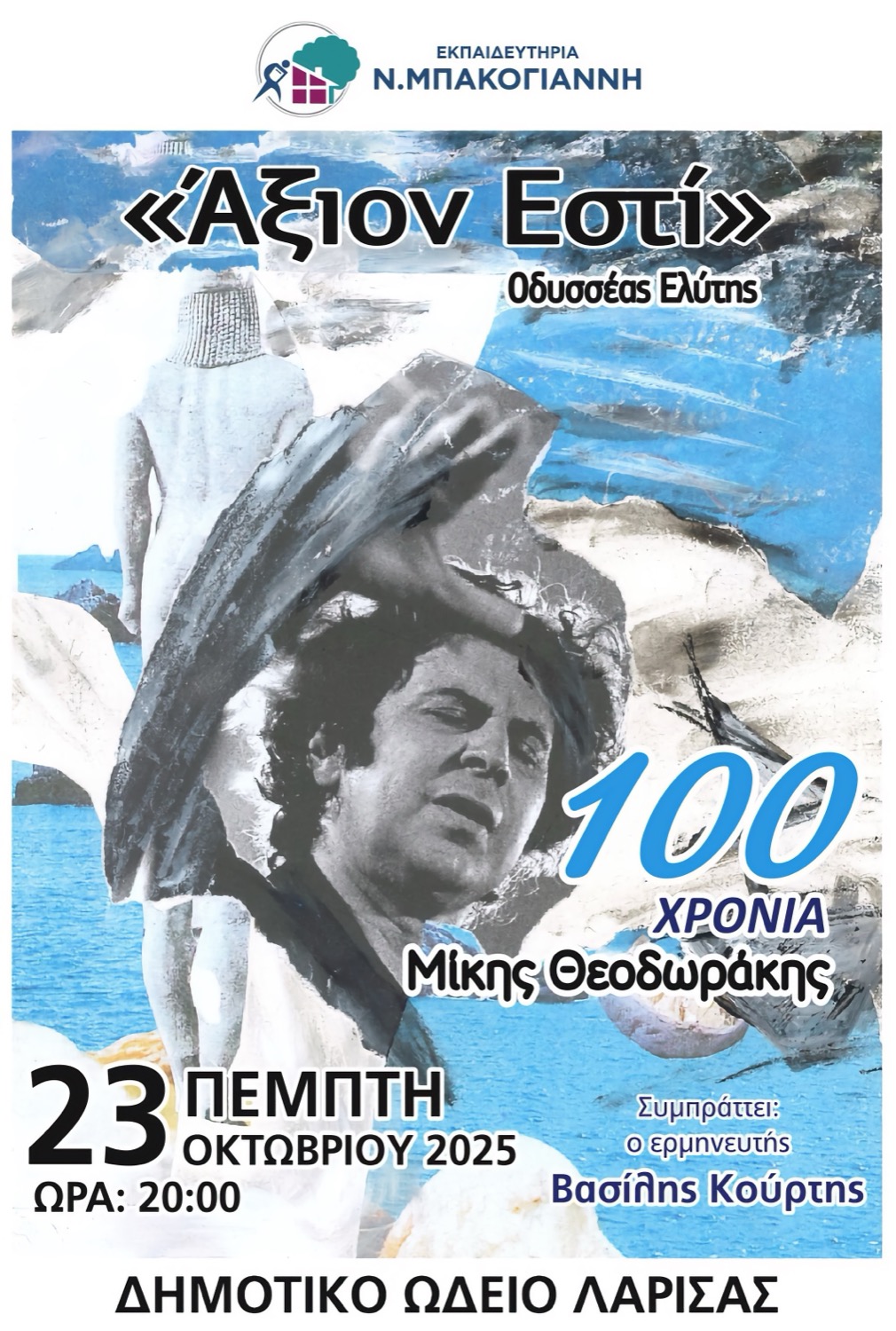 Τιμώντας την Επέτειο αυτή και στο πλαίσιο των εορταστικών εκδηλώσεων για την Επέτειο της 28ηςΟκτωβρίου τα Εκπαιδευτήρια Ν. Μπακογιάννη, την Πέμπτη 23 Οκτωβρίου 2025 και ώρα 8:00 μ.μ. στοΔημοτικό Ωδείο Λάρισας διοργανώνουν μια εκδήλωση αφιέρωμα στον μουσικοσυνθέτη και παρουσιάζουν ένα από τα κορυφαία έργα του το «Άξιον Εστί» σε ποίηση του νομπελίστα Οδυσσέα Ελύτη.