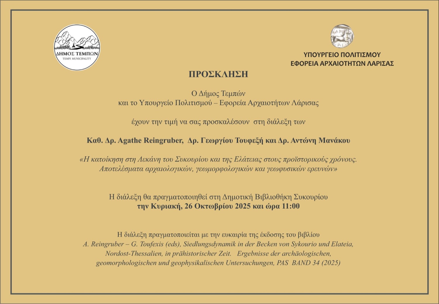 Ο Δήμος Τεμπών, σε συνεργασία με την Εφορεία Αρχαιοτήτων Λάρισας, διοργανώνει την Κυριακή 26 Οκτωβρίου 2025 και ώρα 11:00 π.μ., στη Δημοτική Βιβλιοθήκη Συκουρίου, διάλεξη με θέμα: