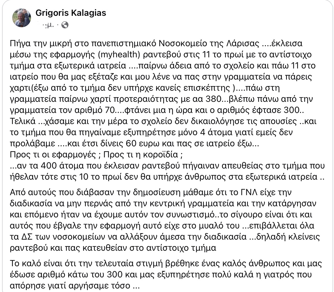 Μεγάλη ταλαιπωρία καταγγέλλει στα μέσα κοινωνικής δικτύωσης ο γνωστός Αγιώτης με εμπλοκκή στα αυτοδιοικητικά κ. Γρηγόρης Καλαγιάς, ο οποίος επισκέφθηκε πρόσφατα το Πανεπιστημιακό Νοσοκομείο Λάρισας μαζί με την ανήλικη κόρη του για προγραμματισμένο ραντεβού στα εξωτερικά ιατρεία, το οποίο είχε κλείσει ηλεκτρονικά μέσω της κρατικής εφαρμογής myHealth.