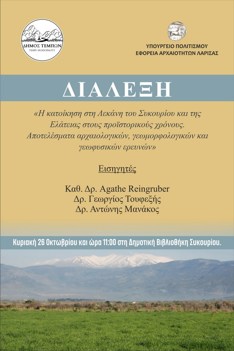 Ο Δήμος Τεμπών σε συνεργασία με την Εφορεία Αρχαιοτήτων Λάρισας διοργανώνει την Κυριακή 26 Οκτωβρίου 2025 και ώρα 11:00 π.μ., στη Δημοτική Βιβλιοθήκη Συκουρίου, διάλεξη με θέμα:
