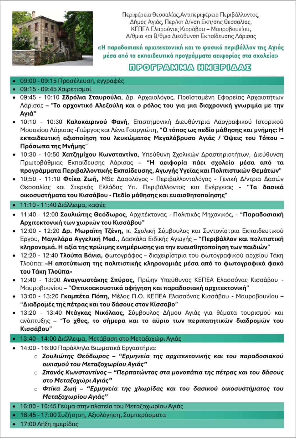 Η Περιφέρεια Θεσσαλίας, Αντιπεριφέρεια Περιβάλλοντος, διοργανώνει ημερίδα με θέμα «Η παραδοσιακή αρχιτεκτονική και το φυσικό περιβάλλον της Αγιάς μέσα από τα εκπαιδευτικά προγράμματα αειφορίας στα σχολεία», σε συνεργασία με τον Δήμο Αγιάς, την Περιφερειακή Διεύθυνση Εκπαίδευσης Θεσσαλίας και το ΚΕΠΕΑ Ελασσόνας–Κισσάβου–Μαυροβουνίου.