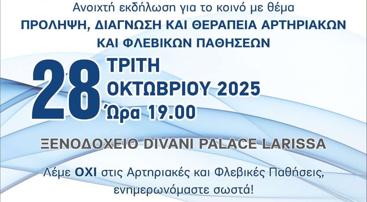 Στα πλαίσια του συνεδρίου Venous Symposium Europe που θα λάβει χώρα στην Αθήνα από 30/10-01/11/2025 και σε συνέχεια της περσινής επιτυχημένης διοργάνωσης της εκδήλωσης-ενημέρωσης για το κοινό με θέμα «Φλεβικές Παθήσεις – Αντιμετώπιση και Θεραπεία» που πραγματοποιήθηκε στις 15/10/2024 , σχεδιάσαμε σε συνεργασία με τους έγκριτους συναδέρφους Λαμπρόπουλο Νίκο και Κοντοθανάση Δημήτριο , μια νέα εκδήλωση ενημέρωσης-ευαισθητοποίησης στις 28/10/2025, ημέρα Τρίτη και ώρα 19.00 στην αίθουσα εκδηλώσεων του ξενοδοχείου Divani Palace Larissa , με θέμα «ΠΡΟΛΗΨΗ, ΔΙΑΓΝΩΣΗ ΚΑΙ ΘΕΡΑΠΕΙΑ ΑΡΤΗΡΙΑΚΩΝ ΚΑΙ ΦΛΕΒΙΚΩΝ ΠΑΘΗΣΕΩΝ».